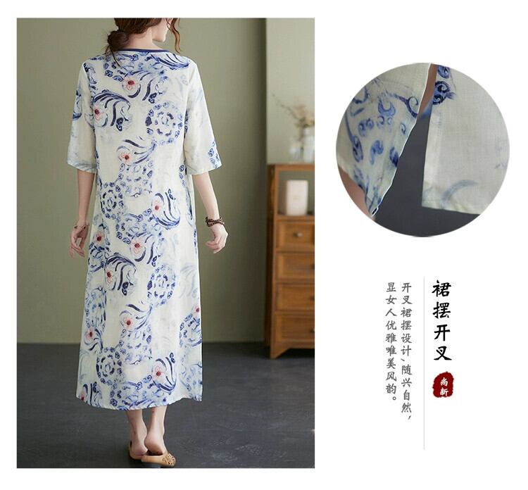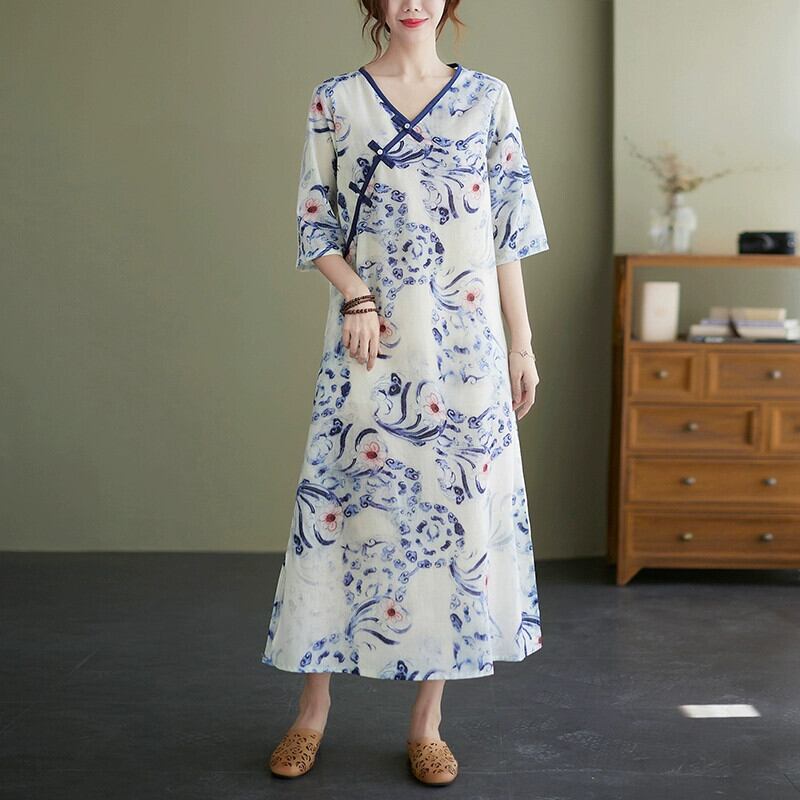 コットンとリネンのドレス2021夏ゆったりとした中国風水墨画西洋風Vネック斜めラペル改良チャイナドレスミドル丈スカート サマー 夏物 sine84766159984