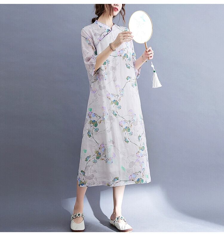 中国風の 5 分袖ドレス夏 2021 新しいゆったりとエレガントなプリント斜めラペルミッドレングス改良されたチャイナ ドレス スカート サマー 夏物 sine90155005620