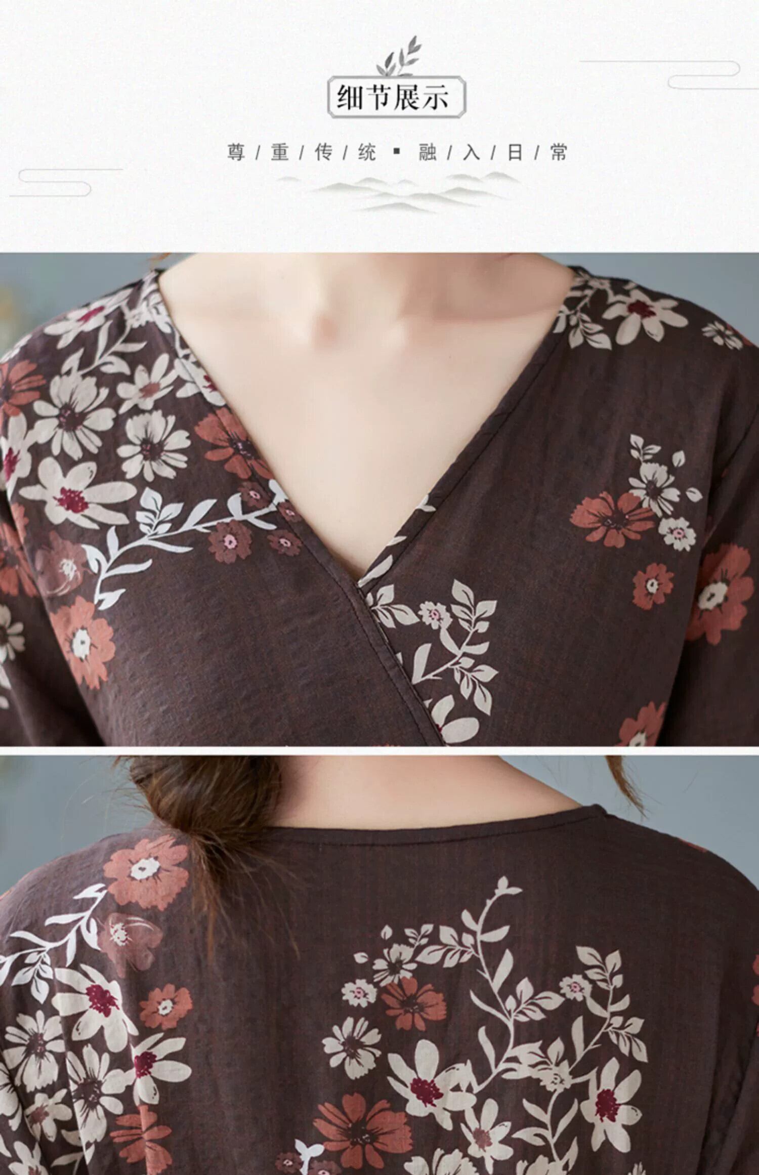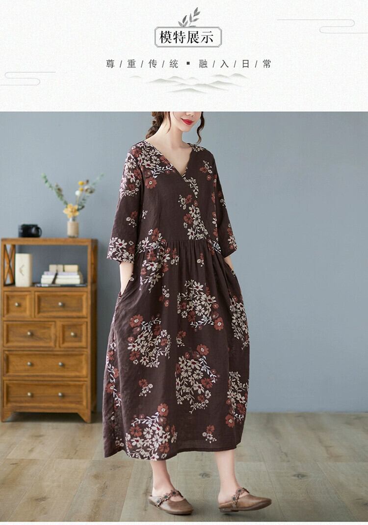 コットンとリネンのドレス夏 2021 ゆったりとスタイリッシュなレトロプリント V ネックスプライシング大きいサイズ 5 分袖リネンミドル丈スカート 大きめサイズ サマー 夏物 Vネック sine2224245315