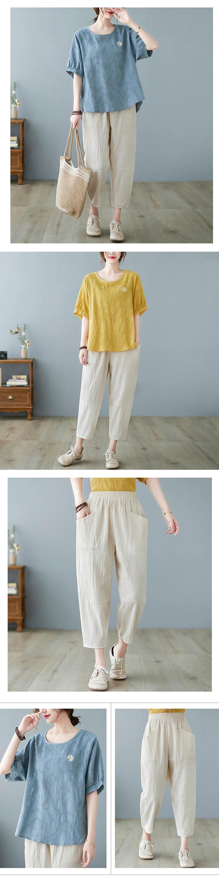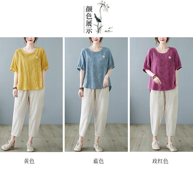 綿とリネンのツーピース夏 2021 新しいジャカード半袖 Tシャツトップカジュアル 9 点ハーレムパンツリネンスーツの女性 コットン サマー 夏物 sine21423864260