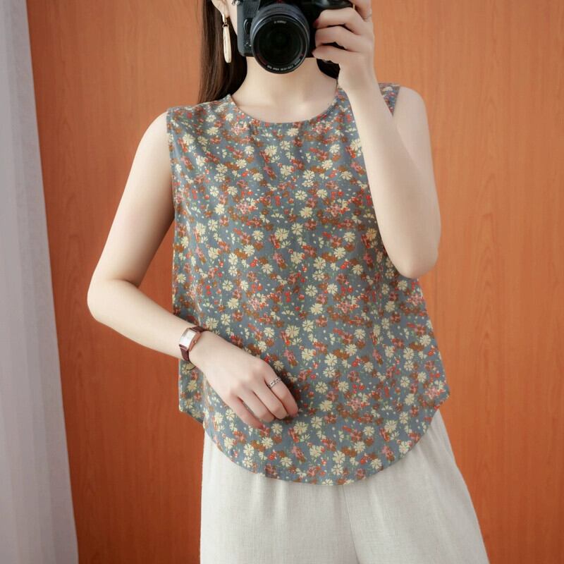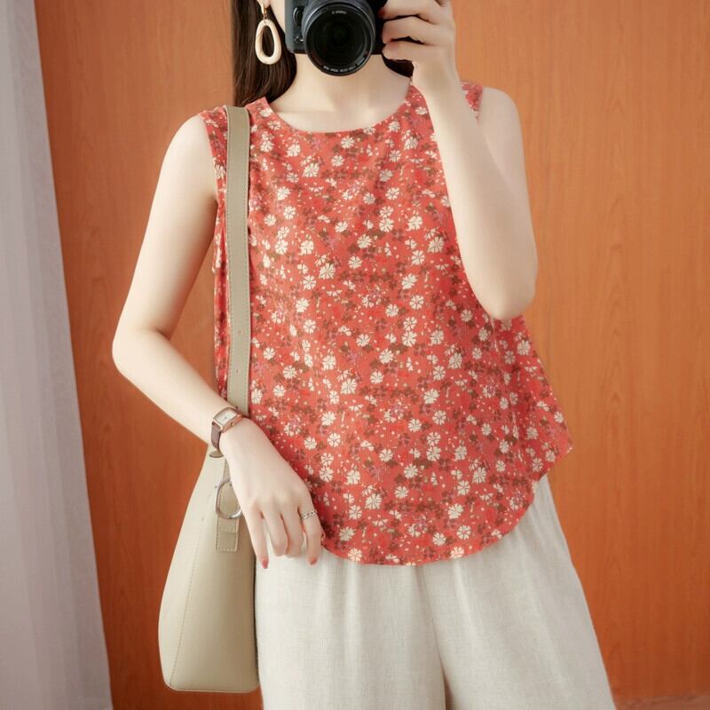 綿とリネンのベスト Tシャツ女性の夏 2021 新しい緩いレトロな年齢を減らす花柄薄いスタイルインナーカジュアルリネントップ コットン サマー 夏物 sine73576960275
