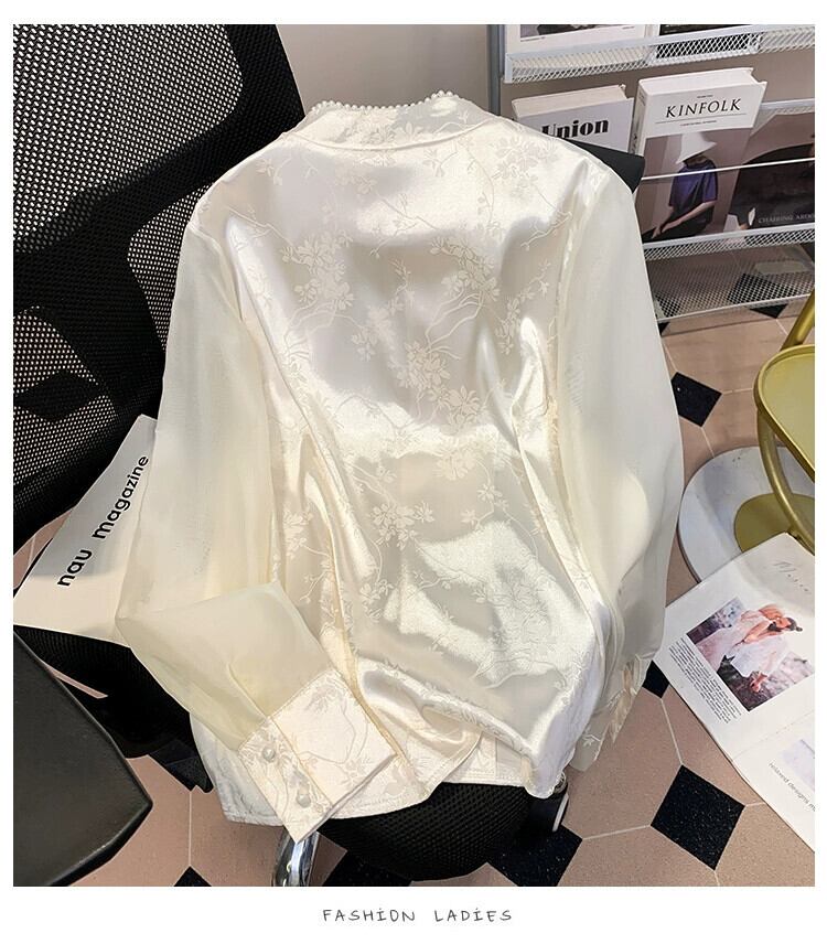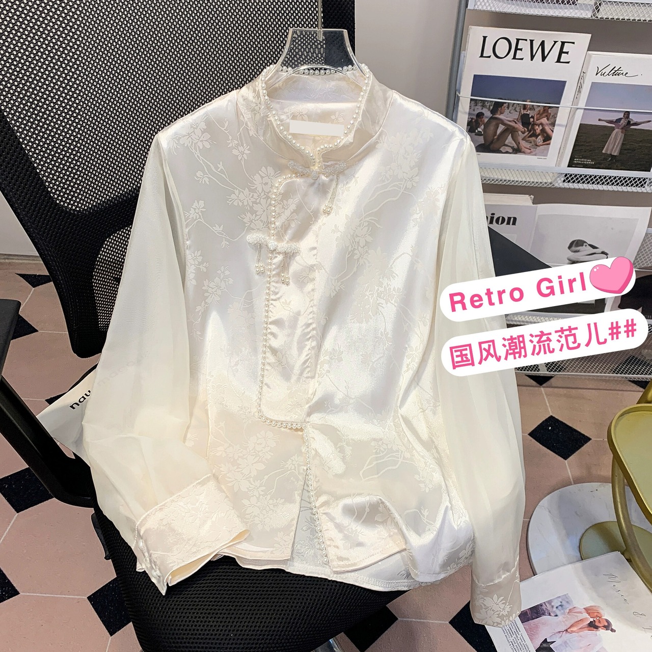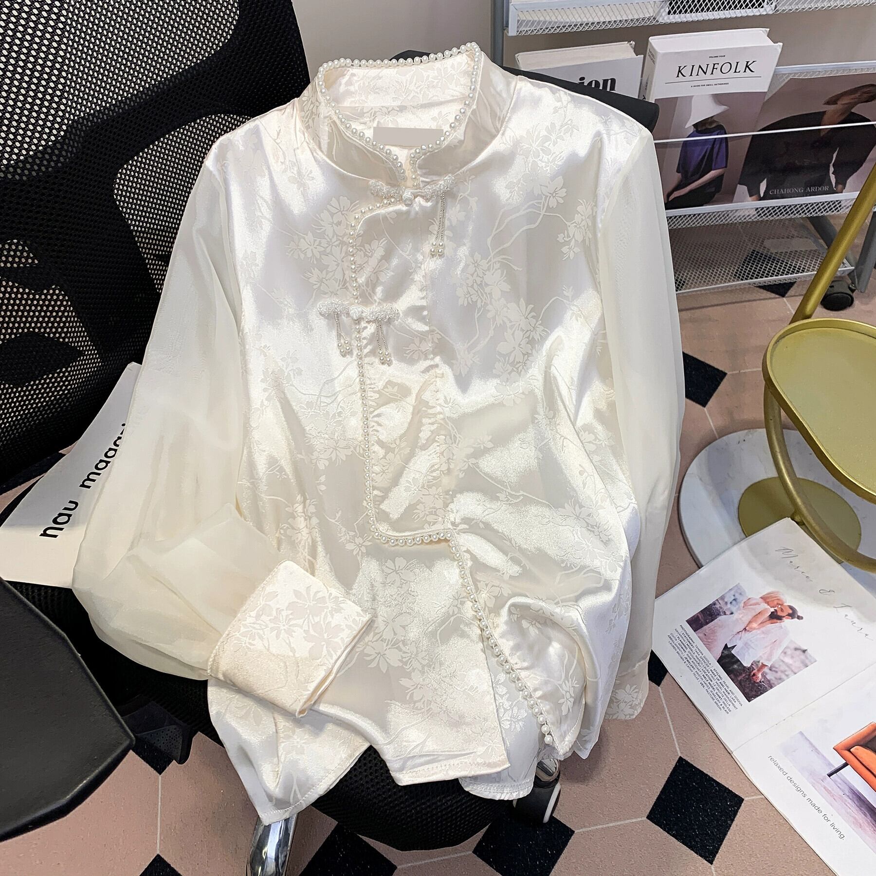 中国風の重工業ビーズアセテートシャツ女性の春と秋のスタイルのハイエンドの気質軽い国民風のディスクボタンスタンドカラー長袖トップ ロング スプリング 春物 オータム 秋物 sine96461711323
