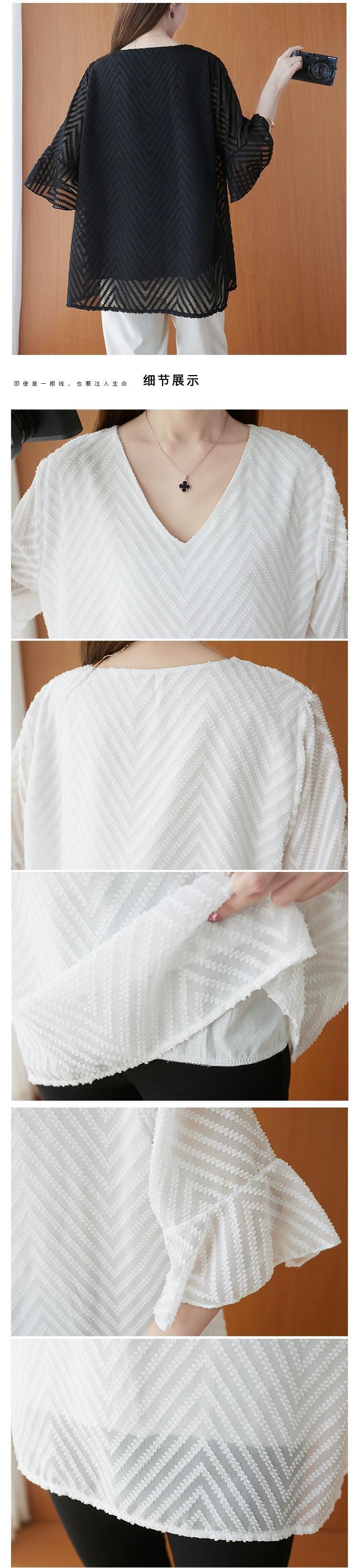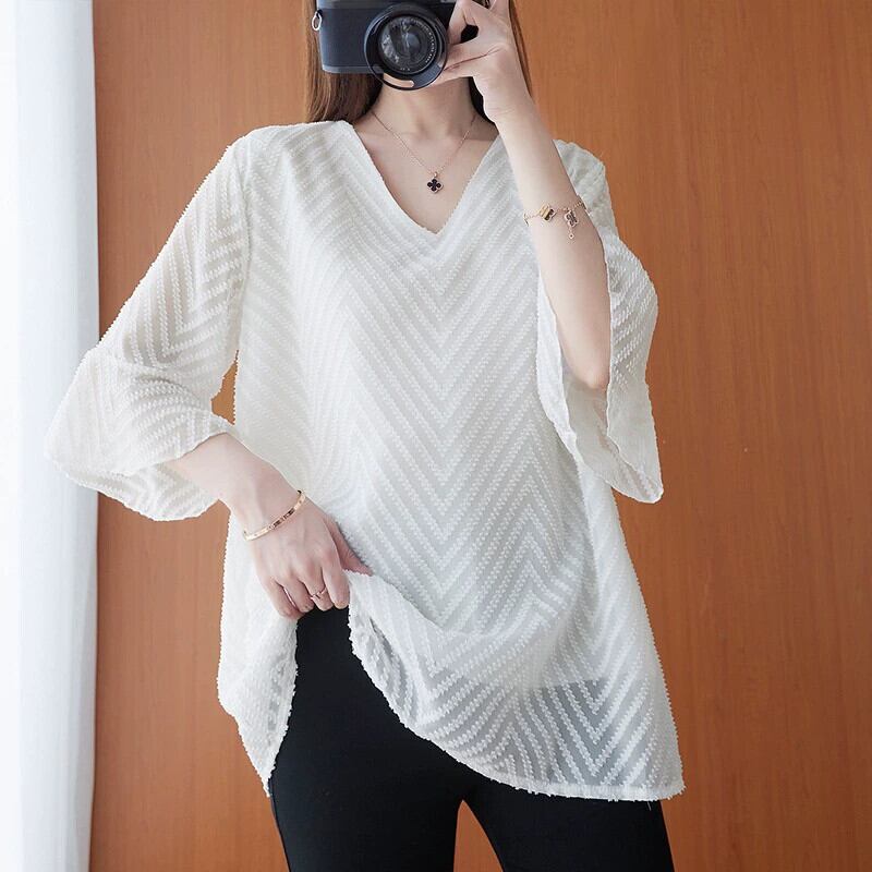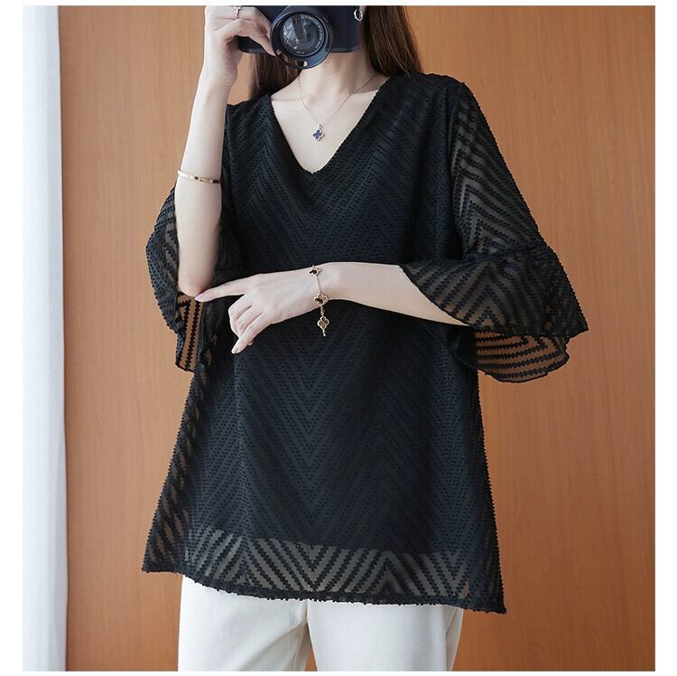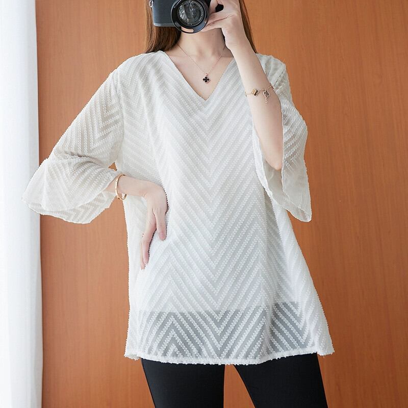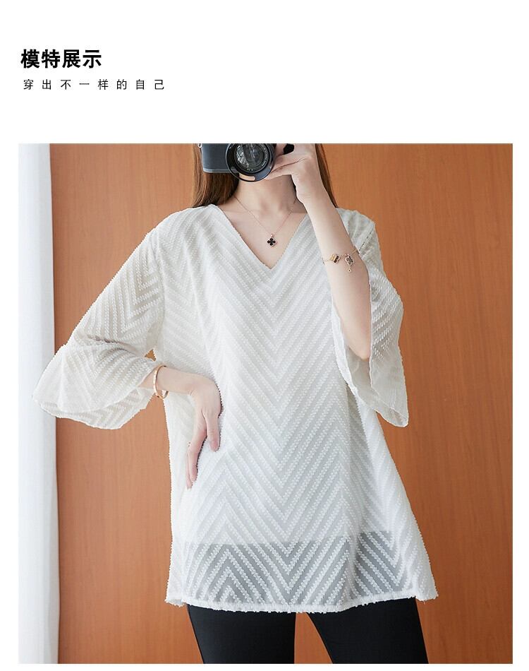プラスサイズの女性のシフォンシャツトップ夏の新しいスタイルルーズ脂肪ミリメートルカバー肉厚スタイル V ネックトランペットスリーブ薄い Tシャツ女性 大きめサイズ サマー 夏物 Vネック sine99327530391