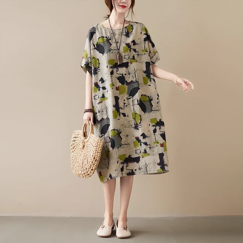 プラスサイズの女性の綿とリネンのドレス夏 2021 ルーズファット mm カバー肉厚スタイルプリント a ライン半袖ミドル丈スカート コットン 大きめサイズ サマー 夏物 Aライン sine26565503076
