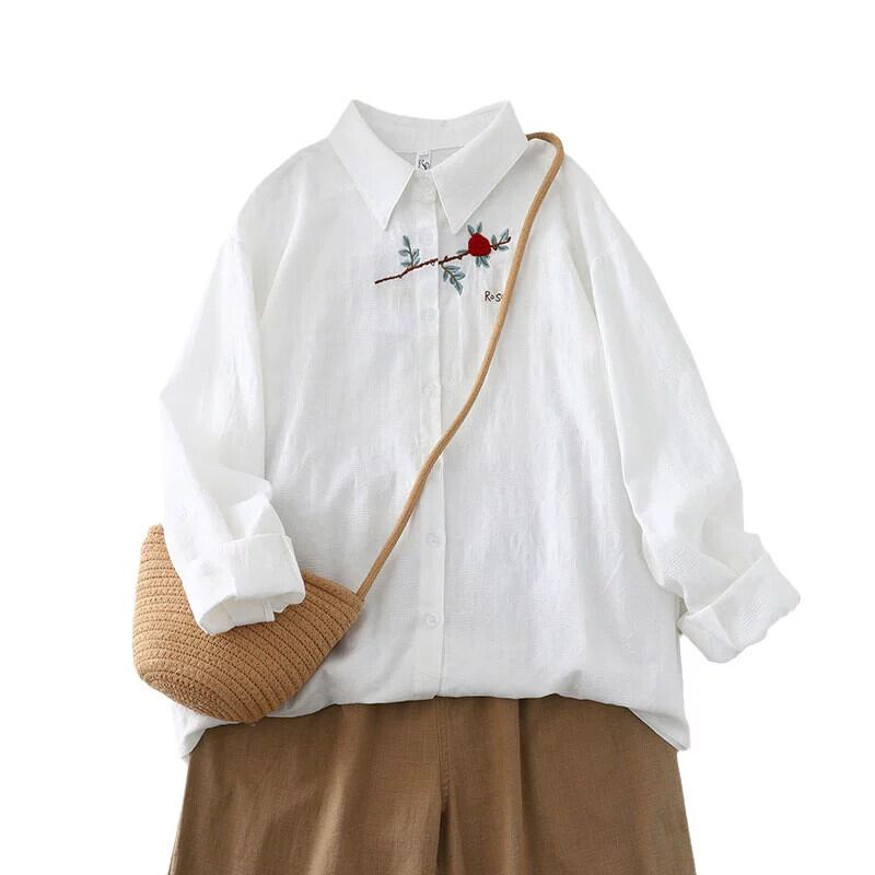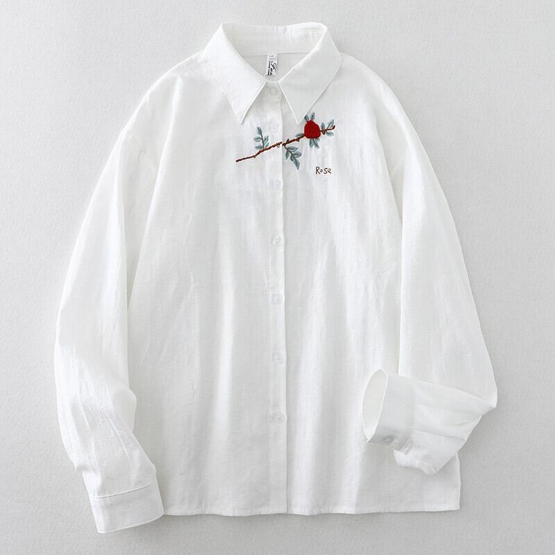 白いシャツの女性の春と秋の新しいスタイルの ese ニッチデザインローズ刺繍シャツルーズカジュアルボトリングトップ ホワイト レッド スプリング 春物 オータム 秋物 sine99610534840