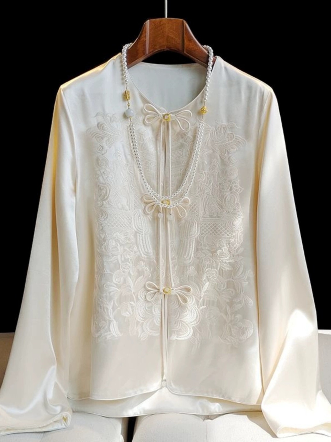 中国風の高級アセテートサテンシャツの女性、春と秋のスタイル、中国風、クールで禅のスタイル、唐スーツプレートボタンコートトップ スプリング 春物 オータム 秋物 sine31624382506