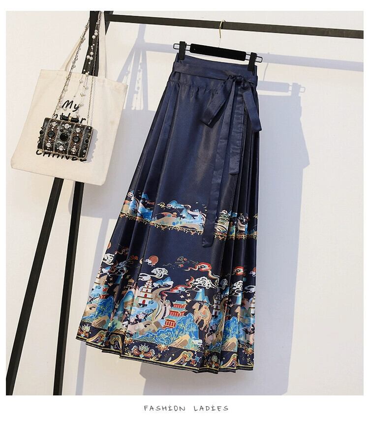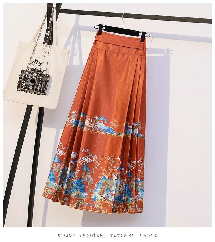 Eign Trade 割引ブランドテールグッズ国民風改善明るい馬の顔スカート女性のハイウエストプリント中国要素 A ラインスカート ハイウェスト Aライン sine41095764178