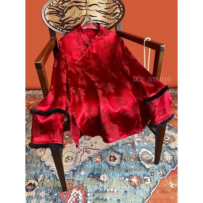 中国風赤ジャカードシャツジャケット女性春の新レトロ国民風スプライシング模造ミンクファースタンドアップカラートップ レッド スプリング 春物 sine96951458899