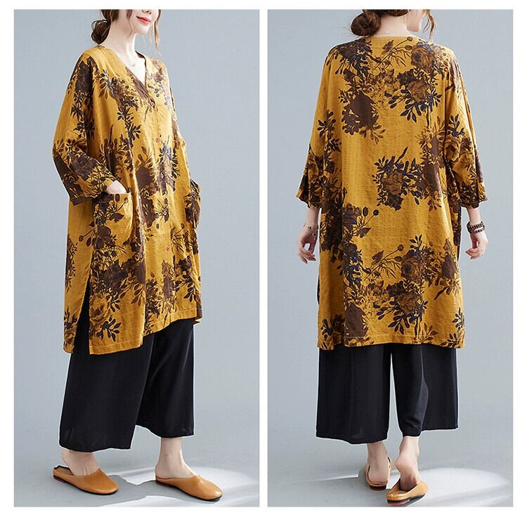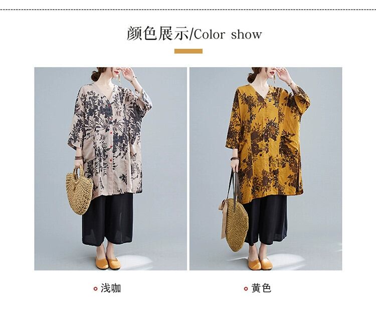 プラスサイズの女性の綿とリネンのシャツドレスの女性の夏ルーズ脂肪ミリメートル中国風水墨画 V ネックミッドレングスドレス コットン 大きめサイズ サマー 夏物 Vネック sine68128255376