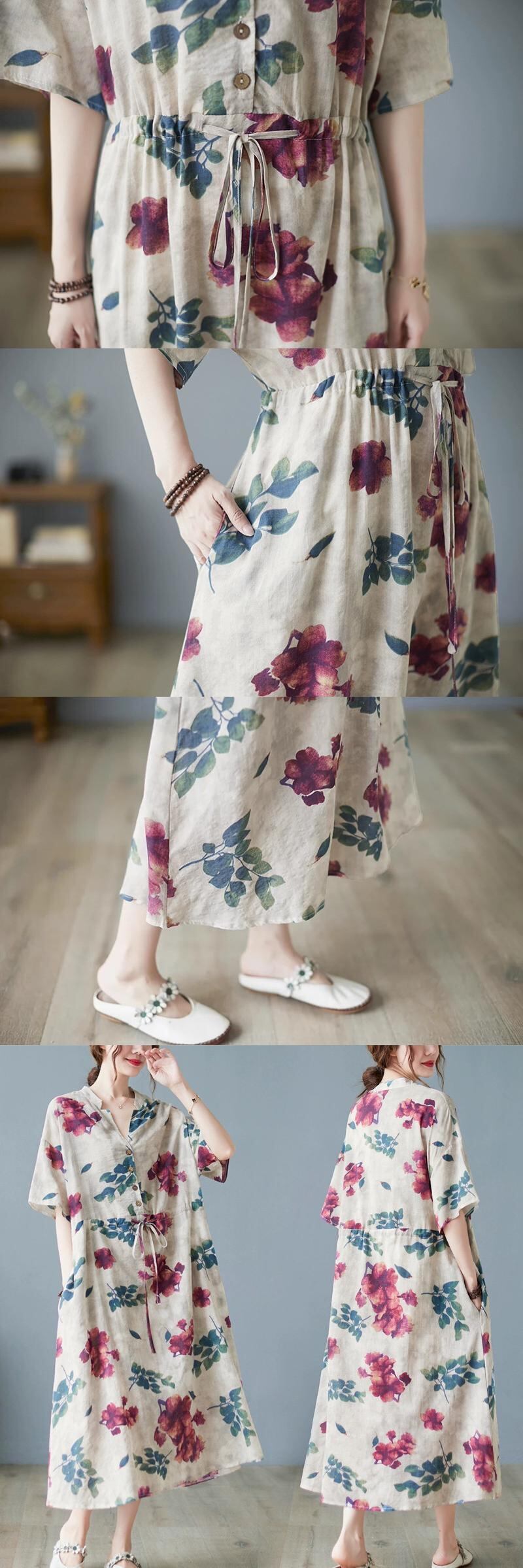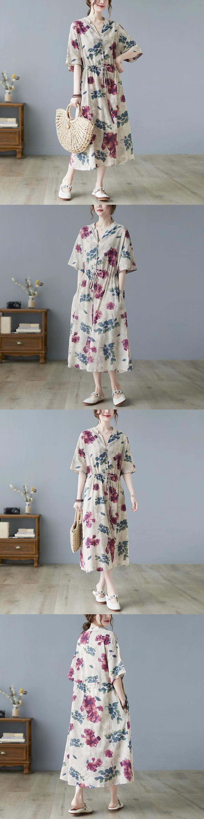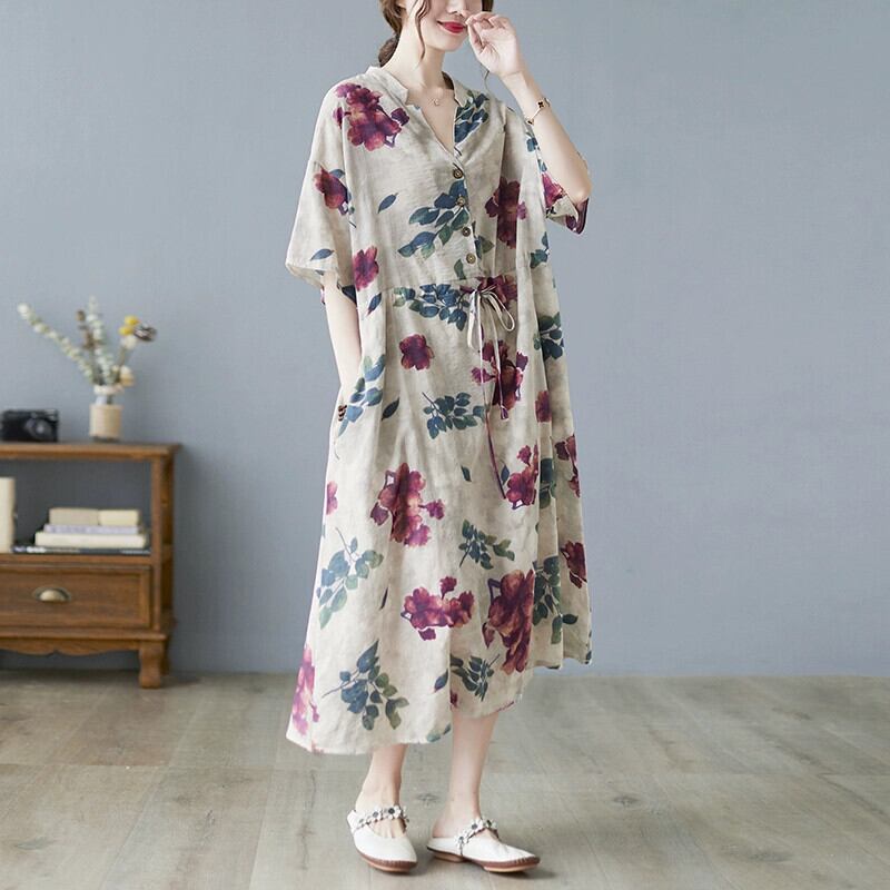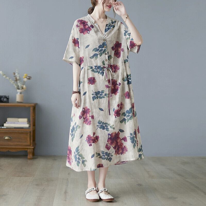 気質 V ネックコットンとリネンのドレス夏ルーズプラスサイズの女性の脂肪 mm 年齢を軽減する花の色のレースのミドル丈のシャツドレス 大きめサイズ サマー 夏物 Vネック フラワーデザイン sine86083683858