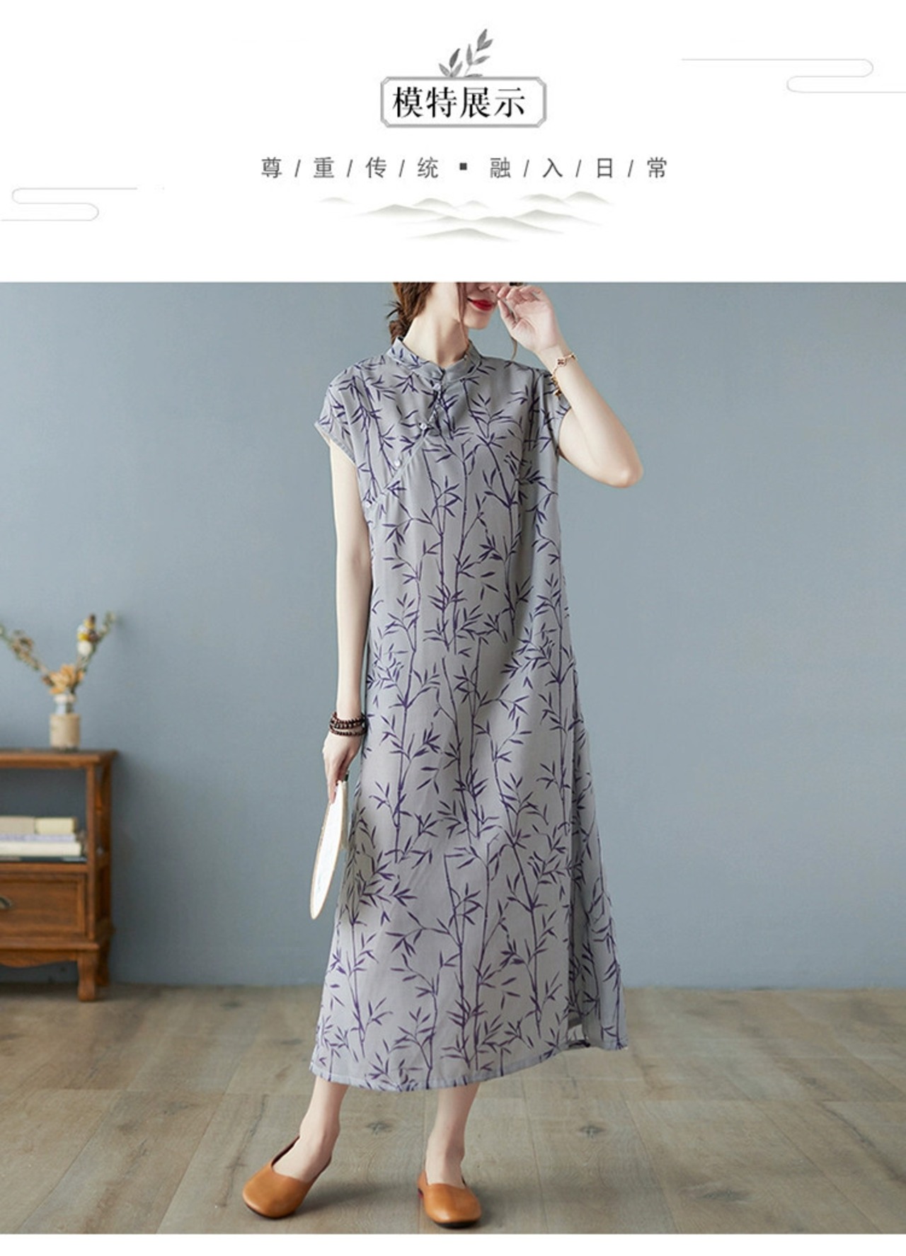 エスニックスタイルの綿とリネンのドレスの女性 2021 夏緩い大きいサイズスタンドカラープリント気質中国風膝上ミッドレングススカート コットン 大きめサイズ サマー 夏物 sine99146707496