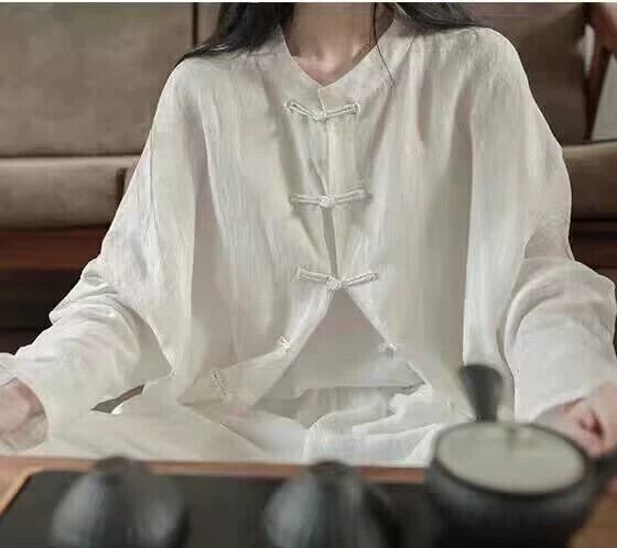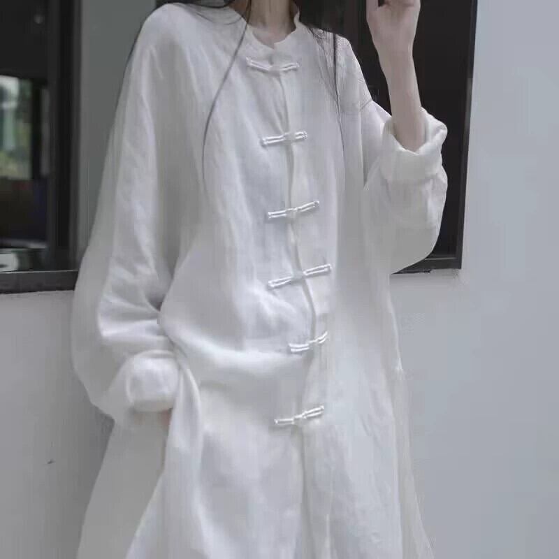 レトロな国民風禅白シャツ女性春夏レトロ中国ボタンアップシャツミッドレングスカジュアル長袖トップ ロング ホワイト スプリング 春物 サマー 夏物 sine70419458871