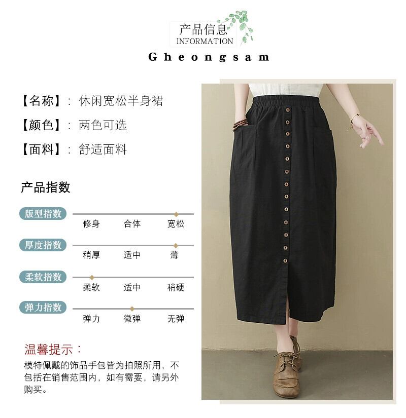 綿とリネンのスカートの女性の夏の 2021 新しい緩いレトロ文学弾性ウエストシングルブレストミッドレングス a ラインスカート コットン エラスティック 伸縮 サマー 夏物 Aライン sine1007112135