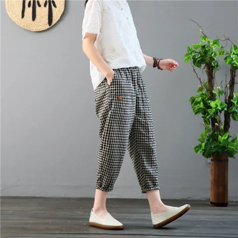 コットンとリネンのハーレムパンツの女性の夏 2021 新しい緩い大きいサイズ芸術的なレトロなチェック柄弾性ウエストカジュアルリネン 9 点パンツ エラスティック 伸縮 大きめサイズ サマー 夏物 sine34240119854