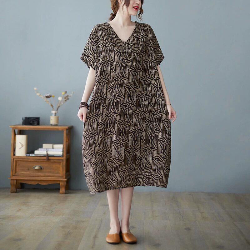 西洋風レトロプリントドレス夏ゆったりプラスサイズ脂肪がお腹をカバーしてスリムに見える半袖Vネックリネンミドル丈スカート 大きめサイズ サマー 夏物 sine36044782453