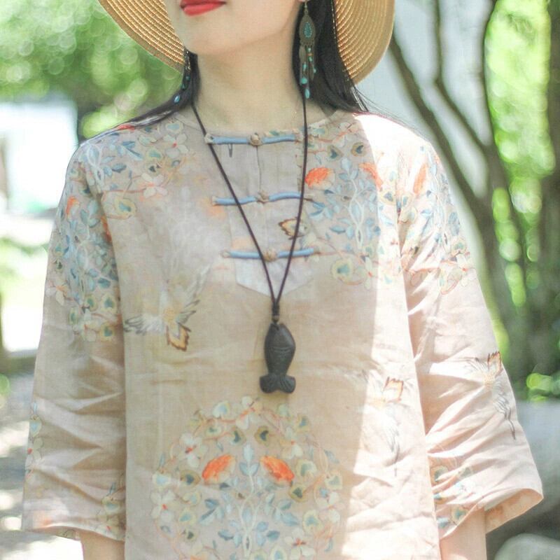 閣僚から撤退した高級ブランド永貿易独身女性中国風ラミープリントトップスコットンリネンミッドスリーブシャツカットオフマーク付き sine13822711345