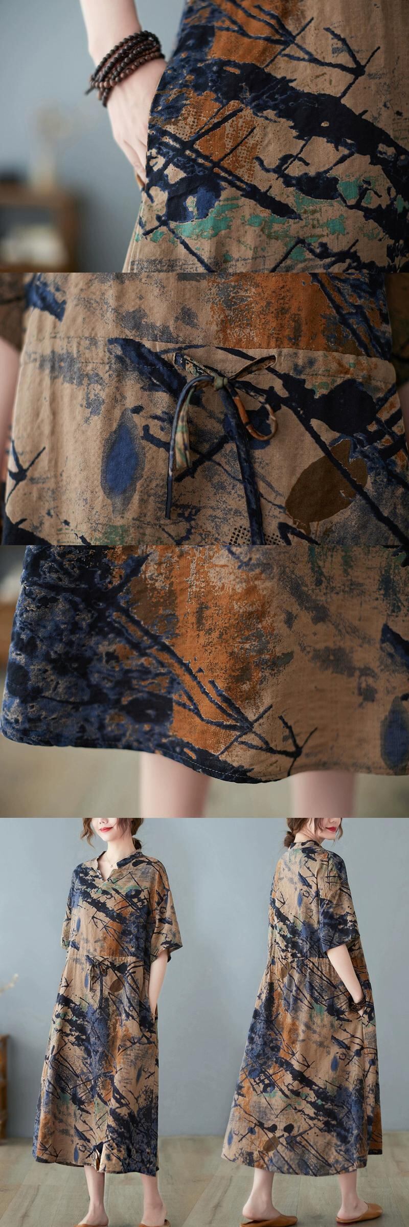 西洋スタイルのレトロな綿とリネンのドレス 2022 夏ゆるい痩身大きいサイズ脂肪 MM プリント V ネックリネンシャツロングスカート コットン 大きめサイズ サマー 夏物 Vネック sine45497348702