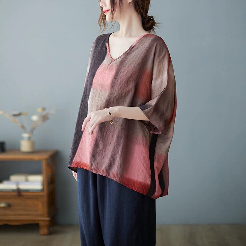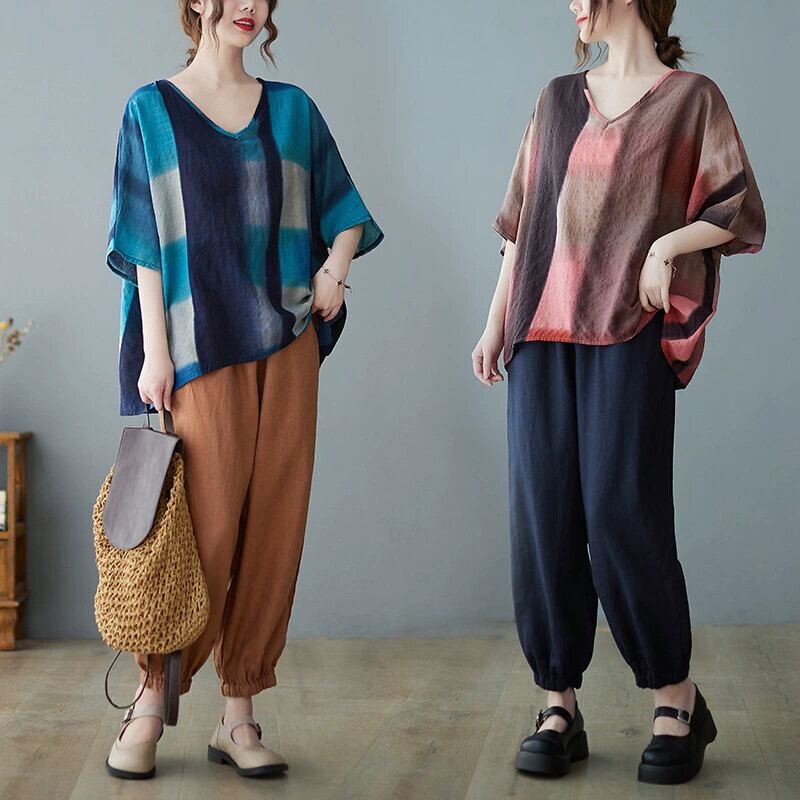 プラスサイズ プラスサイズ レディース 夏 ルーズ ファット シスター レトロ プリント V ネック スリム バット スリーブ コットンとリネン Tシャツ トップ 大きめサイズ サマー 夏物 Vネック sine4344253465