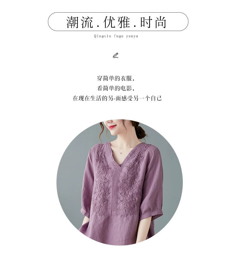 西洋スタイルの刺繍綿とリネンの 5 分袖 Tシャツの女性 2021 夏緩い大きいサイズ薄い V ネックカジュアルリネンシャツトップ レッド コットン 大きめサイズ サマー 夏物 Vネック sine69297338173