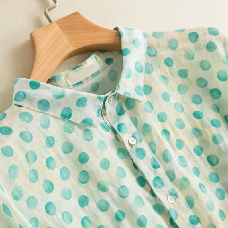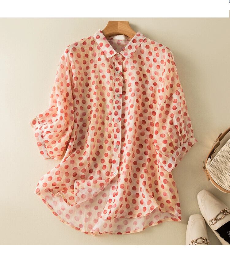 クリアランスリーク〜eseスタイルオリジナルシングル気質ラミートップレディースルーズ年齢軽減水玉模様コットンリネン半袖シャツ薄手 sine17432809114