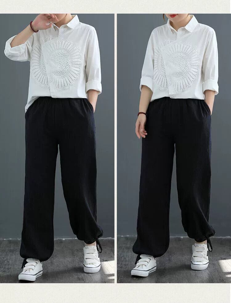 クリアランス漏れの綿とリネンの長袖シャツ、春と秋の女性、ゆったりとした大きいサイズ、レトロなパッチレース、不規則なリネンのトップ ロング コットン 大きめサイズ スプリング 春物 オータム 秋物 sine83425543013