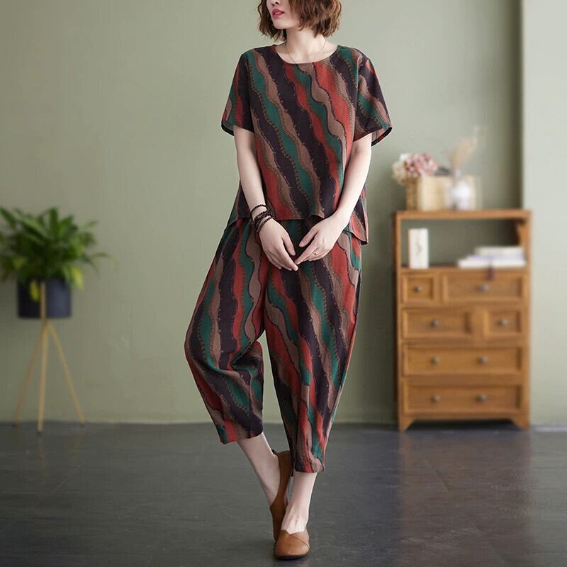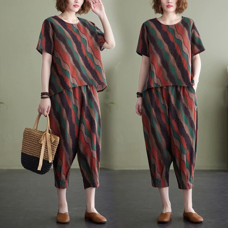 リネンスーツ レディース 夏 レトロプリント 半袖 Tシャツ トップス カジュアル ハーレム 9点パンツ ママ 綿麻 2点セット コットン サマー 夏物 sine12525148948