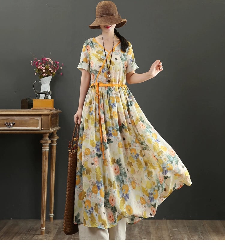 eign trade イタリアンテールグッズブランド ブロークンサイズ 大きい裾 ラミーローブ レトロプリント Vネック コットンリネンドレス sine21874401318