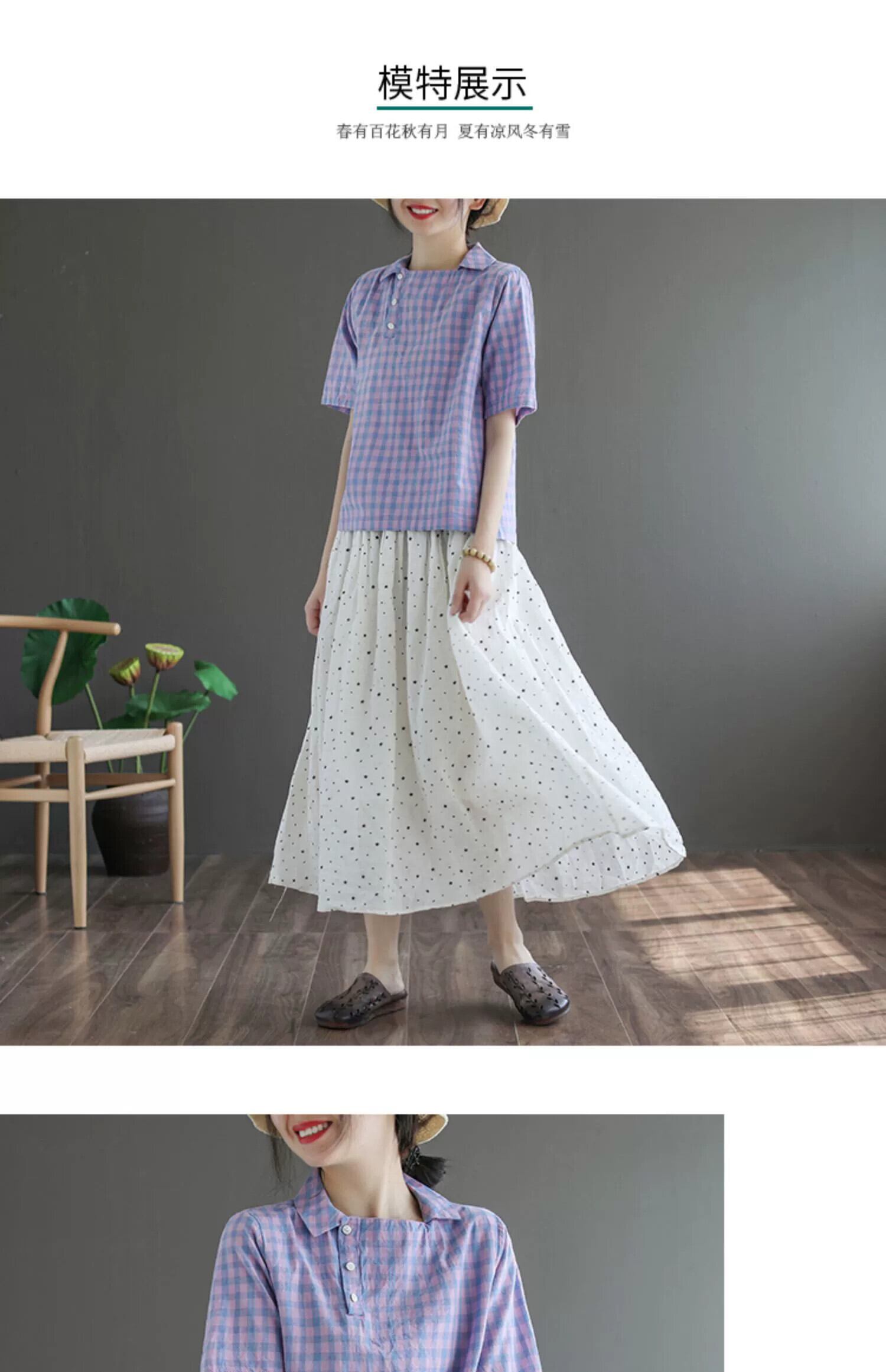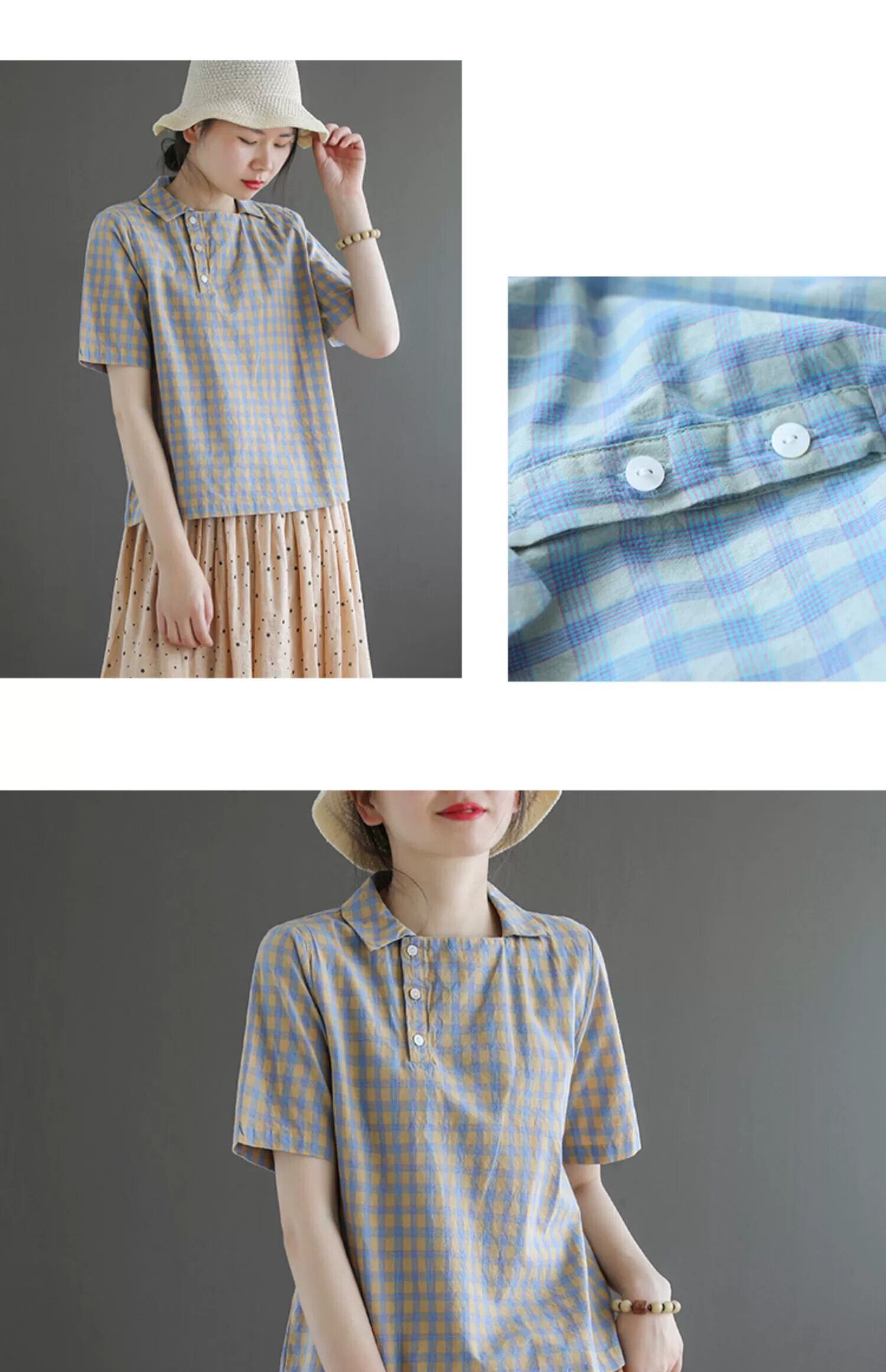 eign trade ese and tailグッズ、激安特価、レディース夏綿麻半袖Tシャツ、レトロラペルチェック柄リネントップス コットン サマー 夏物 sine71023480077