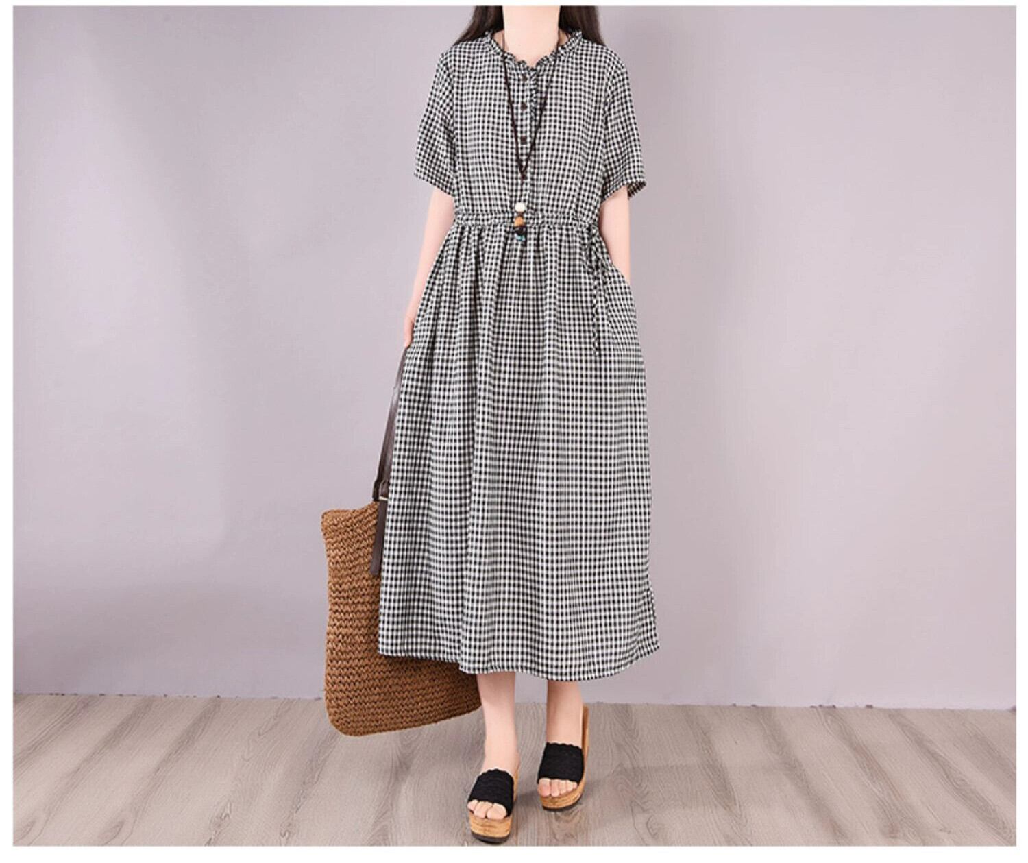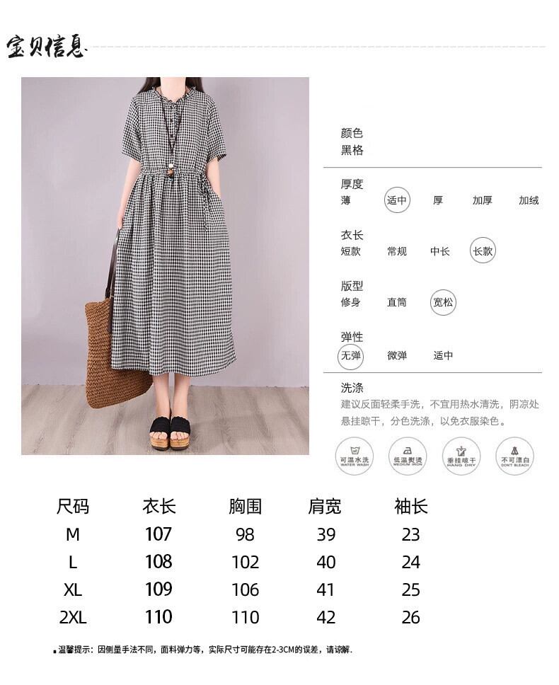 カットラベルショッピングモール撤退女性の綿とリネンのドレスルーズレースアップウエスト痩身リネンチェック柄シャツロングスカート コットン sine51351158171