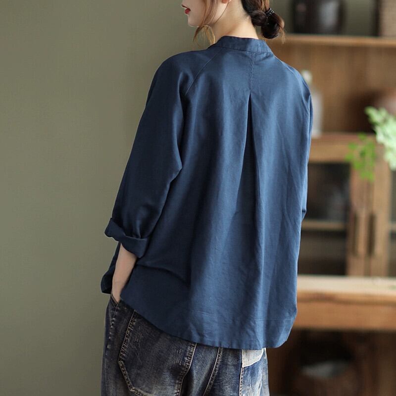 コットンとリネンの長袖シャツ初秋の新しいルーズ痩身プラスサイズの女性の脂肪ミリメートルレトロソリッドカラースタンドカラーリネントップ ロング 大きめサイズ オータム 秋物 sine87156270305