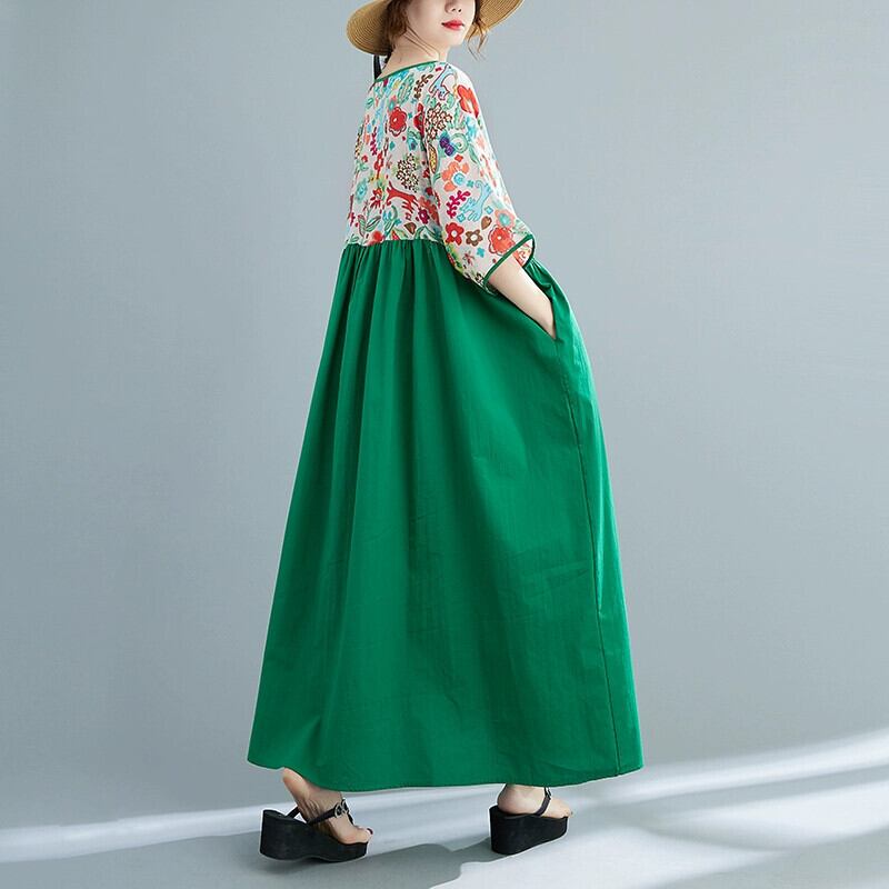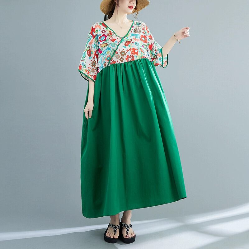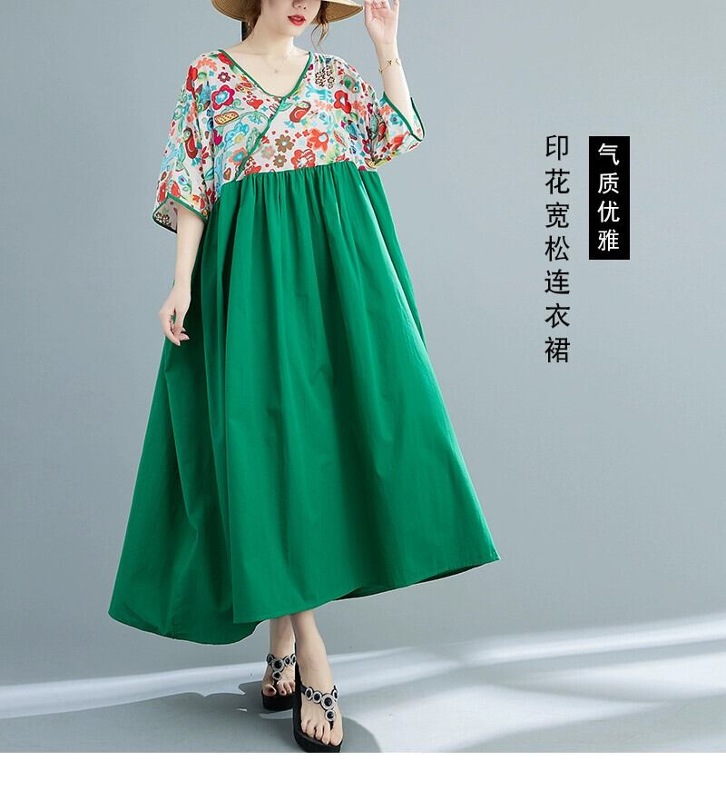 200 プラスサイズの女性の半袖ドレス夏ルーズファットシスターレトロプリントステッチ V ネックハイウエスト大きな裾ローブ ハイウェスト 大きめサイズ サマー 夏物 Vネック sine6315559574