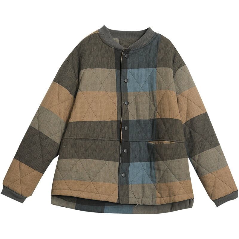 クリアランスリーク〜秋と冬の薄いダウンパッド入りのジャケットの女性、ゆったりとした大きいサイズのチェック柄のコントラストカラーの暖かいスタンドアップカラーのカジュアルジャケット 大きめサイズ オータム 秋物 ウィンター 冬物 sine38450279308