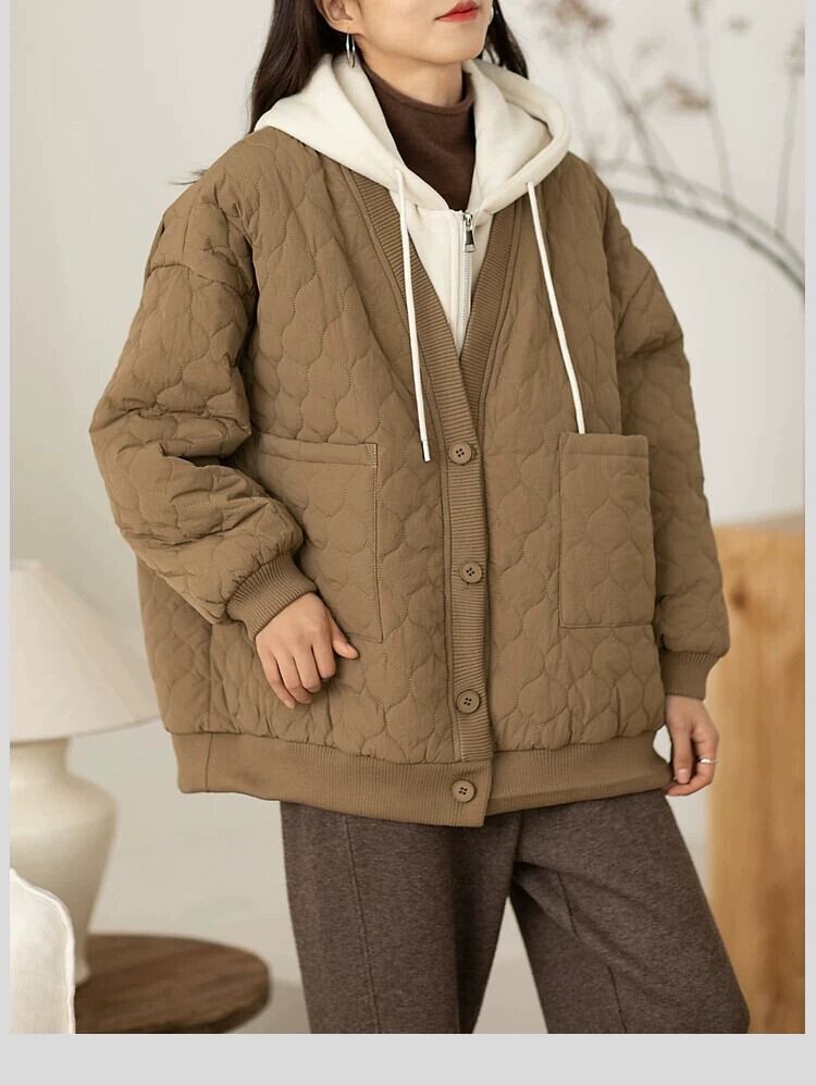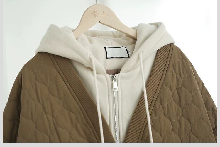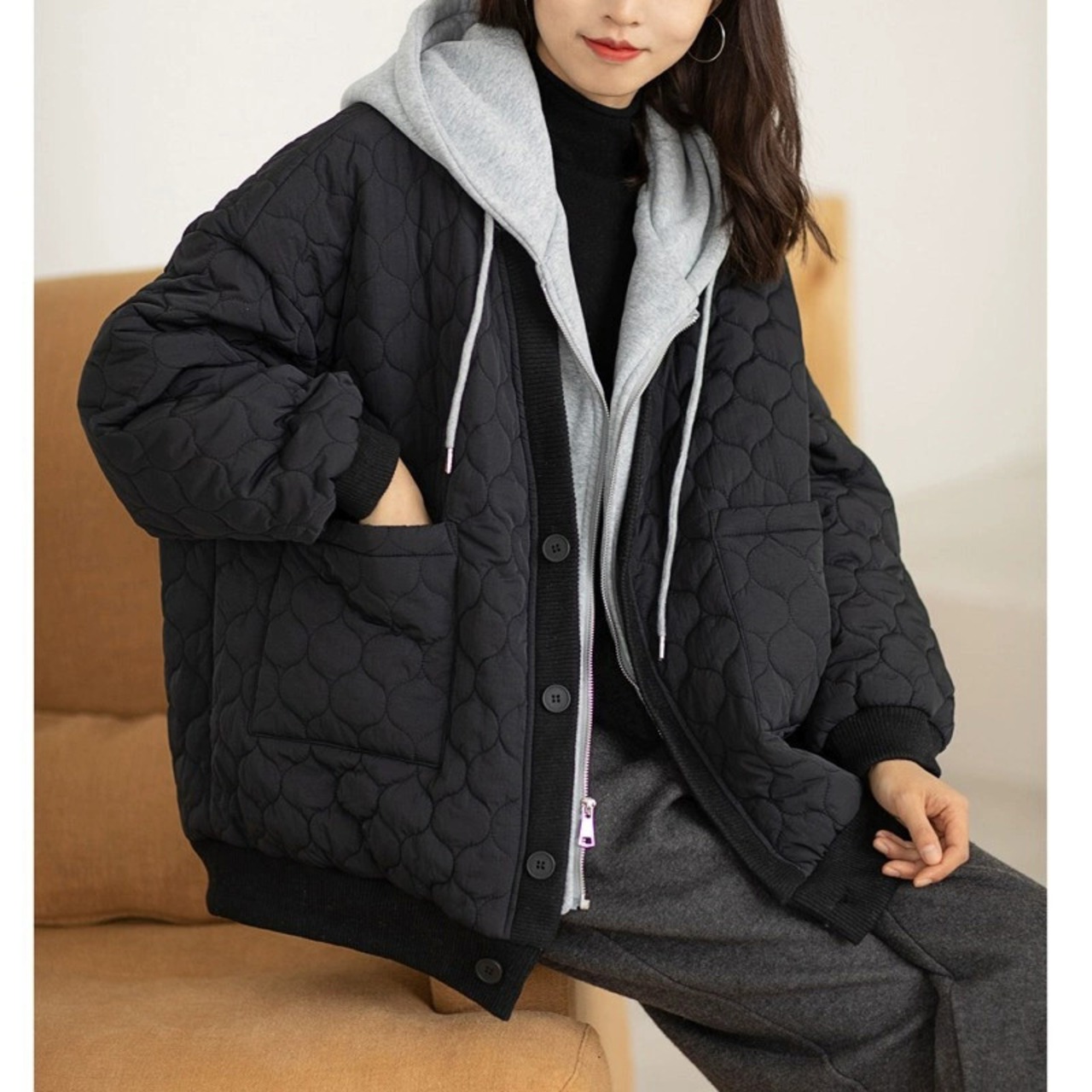 秋冬の薄いダウンパッド入りジャケットの女性、ゆったりとした大きいサイズ、厚くて暖かい、レトロな菱形のフード付きスプライシングフェイクツーピースコート 大きめサイズ オータム 秋物 ウィンター 冬物 sine41399553967