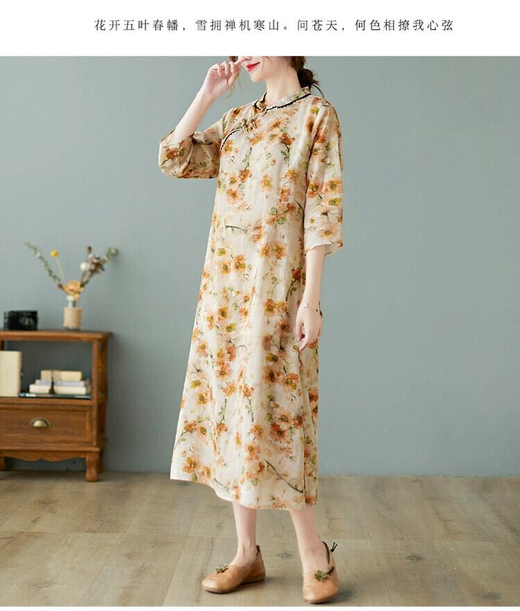コットンとリネンのドレスの女性 2021 夏緩い大きいサイズの気質レトロプリント斜め前立てミッドスリーブ改良されたチャイナドレスミドル丈スカート 大きめサイズ サマー 夏物 sine50612595290