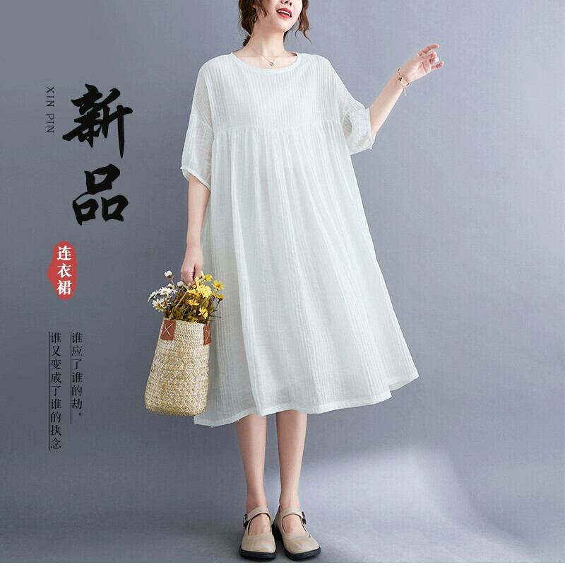コットンとリネンのドレスの女性、夏ルーズ、大きいサイズ、脂肪、200ポンド、お腹をカバー、細く見える、大きな裾、ミドル丈の妖精スカート 大きめサイズ サマー 夏物 sine58339389991