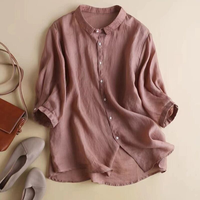 クリアランス漏れ~eign tradeビッグブランドカットオフ品eseラミー刺繍トップスカジュアルコットンとリネン半袖シャツレディース レッド sine1009065356