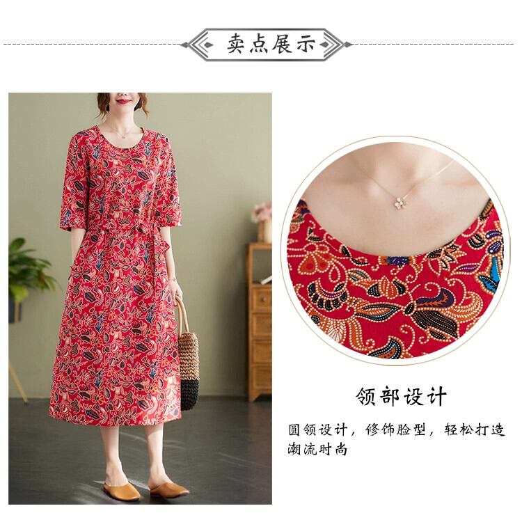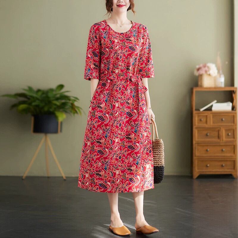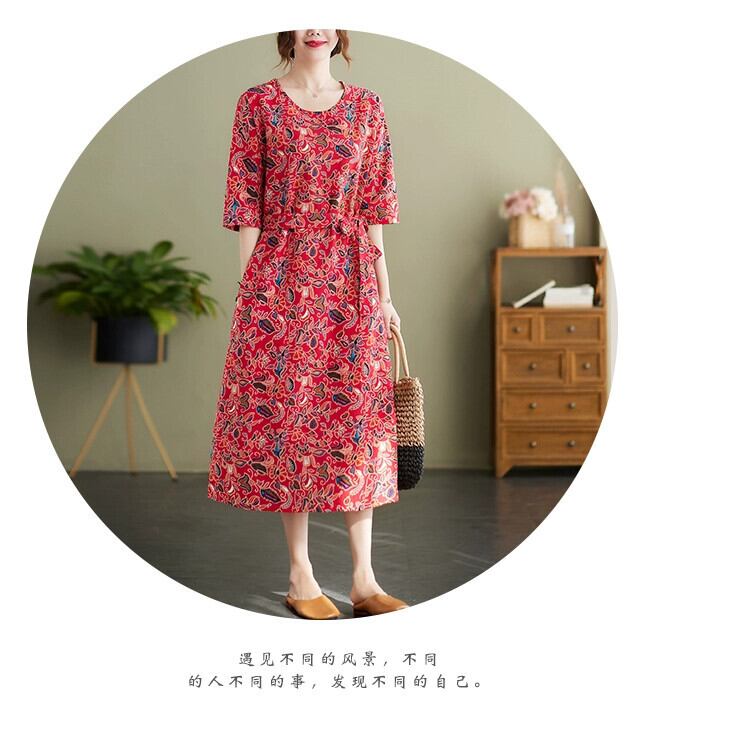 コットンとリネンのドレスの女性の夏ルーズな大きいサイズのレトロな文学的な花柄の薄いスタイルの通気性のあるスリムカジュアルリネンミドル丈スカート 大きめサイズ サマー 夏物 sine56186562100