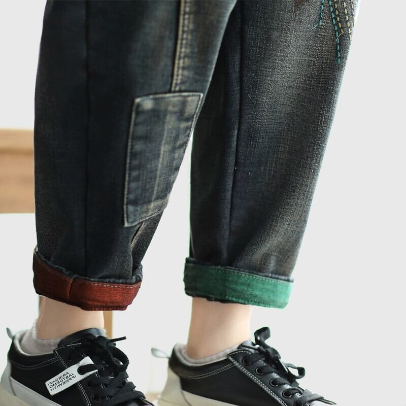 ダメージ加工デニムハーレムパンツ女性の春と秋 2022 レトロ刺繍コントラストカラールーズ大きいサイズキャロットダディパンツ 大きめサイズ スプリング 春物 オータム 秋物 sine97600115695