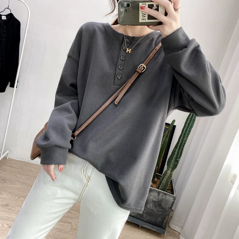 長袖トレーナーボトシャツ女性秋 2021 冬の新ルーズ大きいサイズファット mm スタイルボタンプルオーバー Tシャツトップ ロング 大きめサイズ オータム 秋物 ウィンター 冬物 sine22718153093
