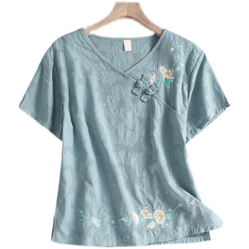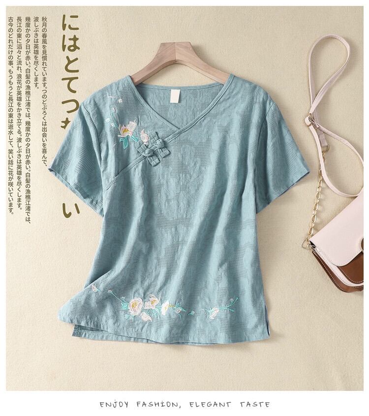 特別オファー〜コットンとリネンの半袖Tシャツの女性の夏ルーズな大きいサイズの中国風斜めの前立てボタン刺繍ラミーリネントップ レッド 大きめサイズ サマー 夏物 sine19583251324
