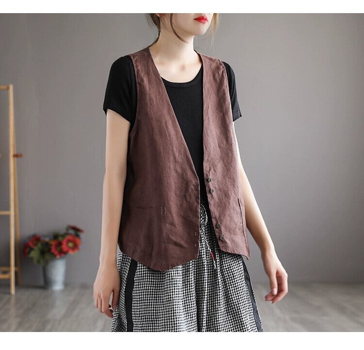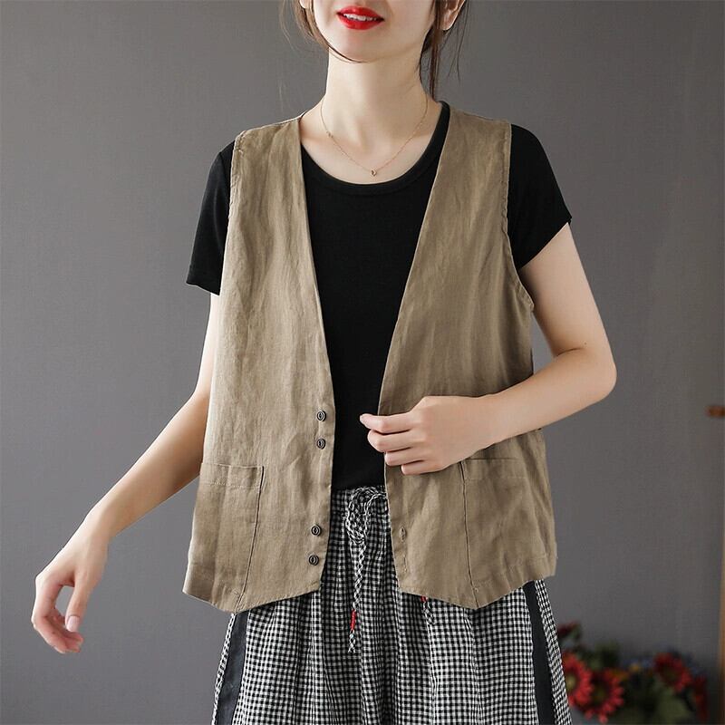 ese ハイエンドブランド eign trade 輸出カットラベル女性のレトロな薄いリネン V ネックトップカジュアル綿とリネンのベストベスト コットン Vネック sine34052813213