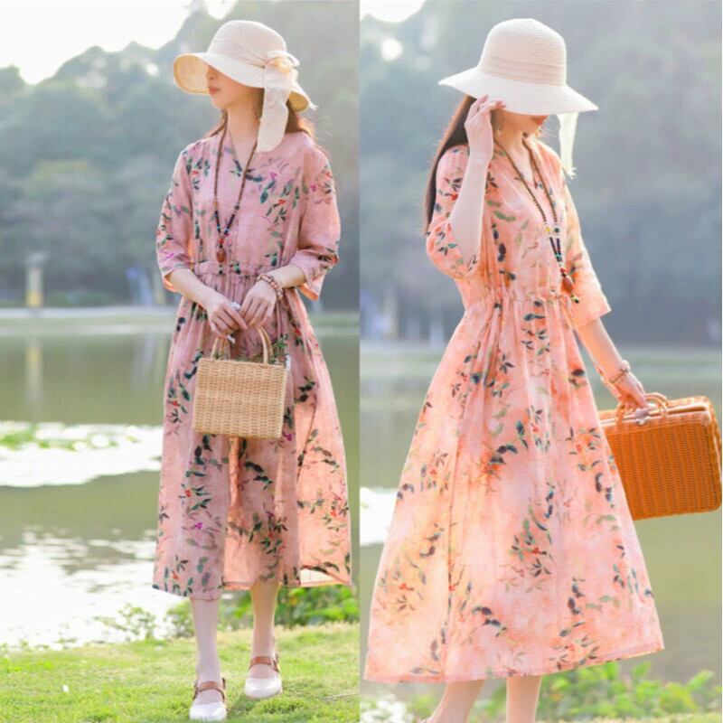 綿麻七分袖ワンピース 夏風 ゆったり 大きいサイズ レトロ風 レトロ柄 膝上着痩せ Vネックリネンロングスカート コットン 大きめサイズ サマー 夏物 sine65335895017