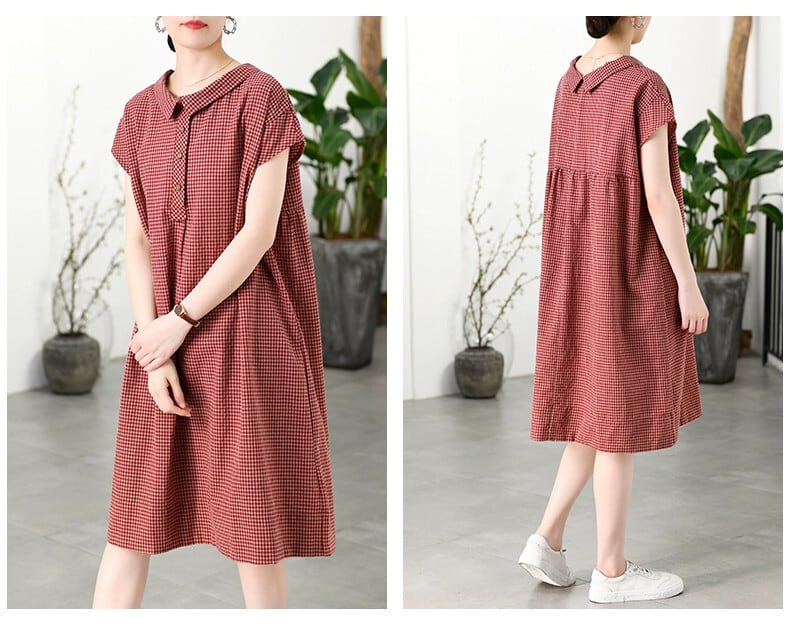 eign trade ese オリジナルシングルテール品 キャビネットから引き出し レディース仕立て ミドル丈 綿麻チェック柄ワンピース リネン半袖シャツワンピース コットン sine8590055368
