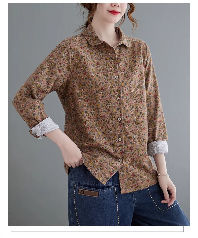 綿とリネンのシャツの女性 2022 春と秋の新ルーズ大きいサイズレトロカジュアル花柄長袖ポロ襟リネントップス ロング コットン 大きめサイズ スプリング 春物 オータム 秋物 sine73536246901