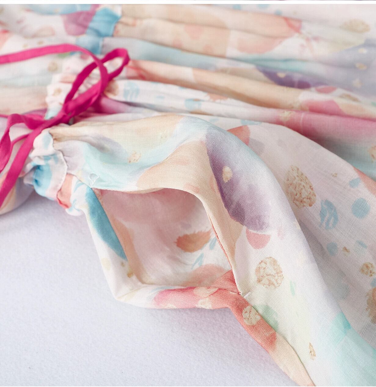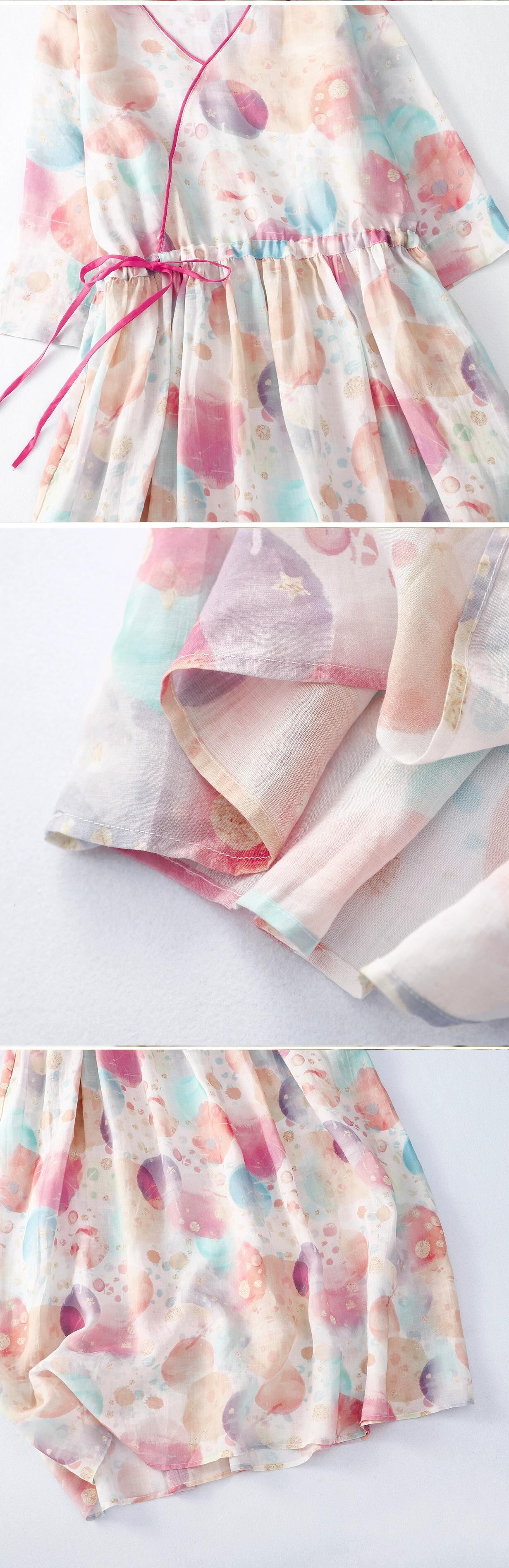 eign trade 激安ブランドテールグッズレディースアーティスティックプリントラミー V ネックドレスウエストレースアップリネン半袖ロングスカート Vネック sine15663019734