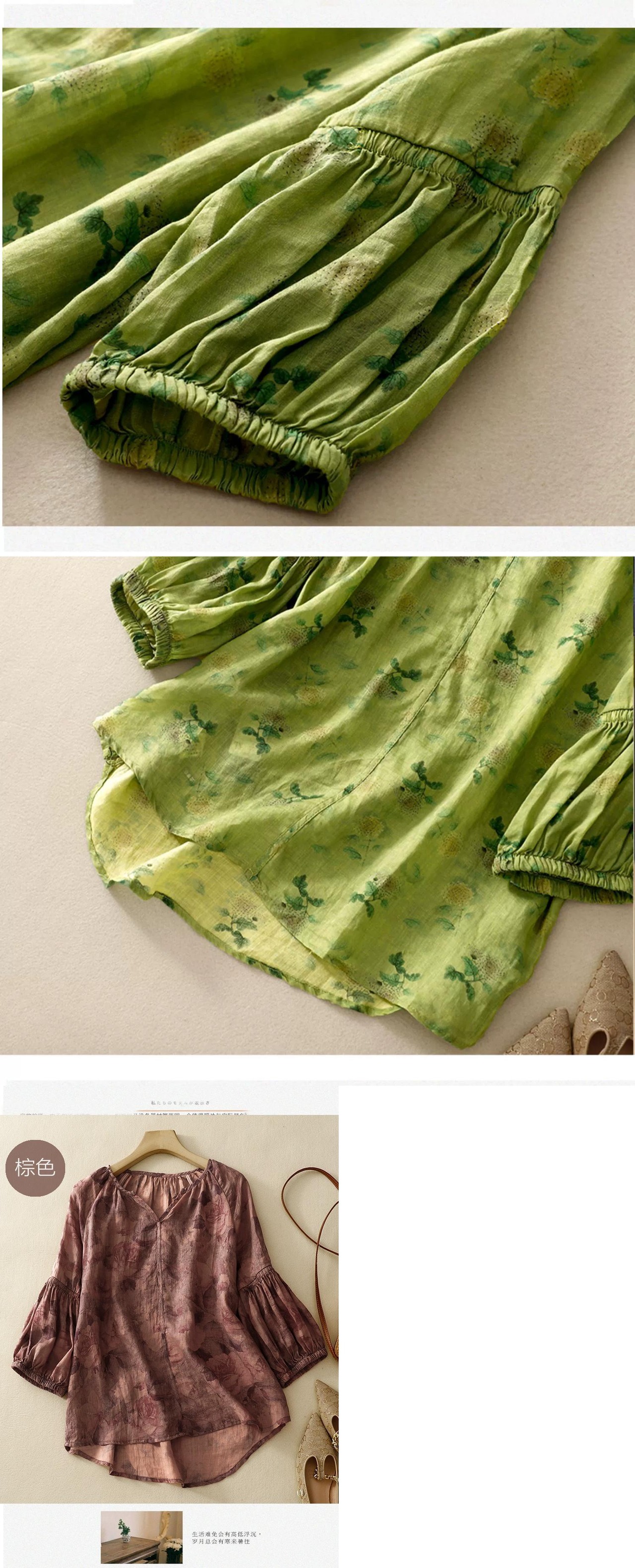 クリアランス漏れ〜カウンター最後の在庫レトロ花柄コットンとリネンのランタンスリーブシャツ女性の夏のルーズ V ネックリネントップ サマー 夏物 Vネック sine32733024141