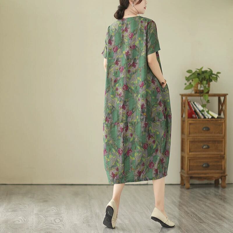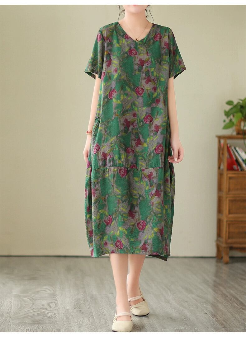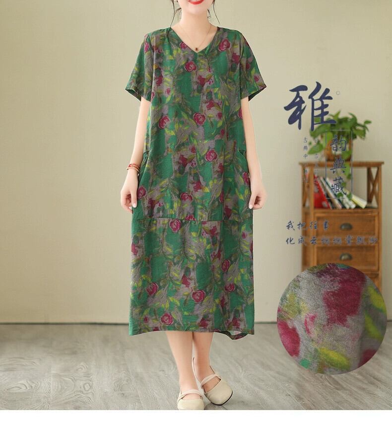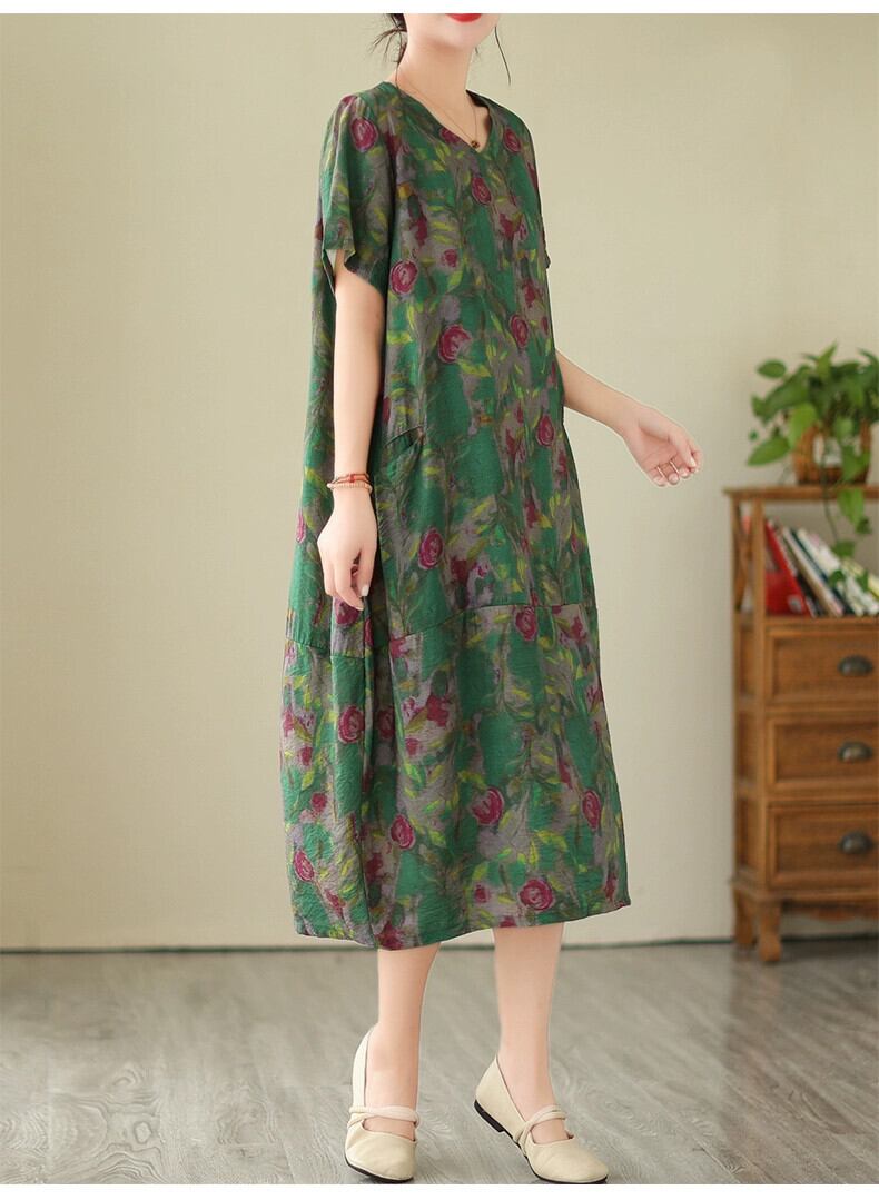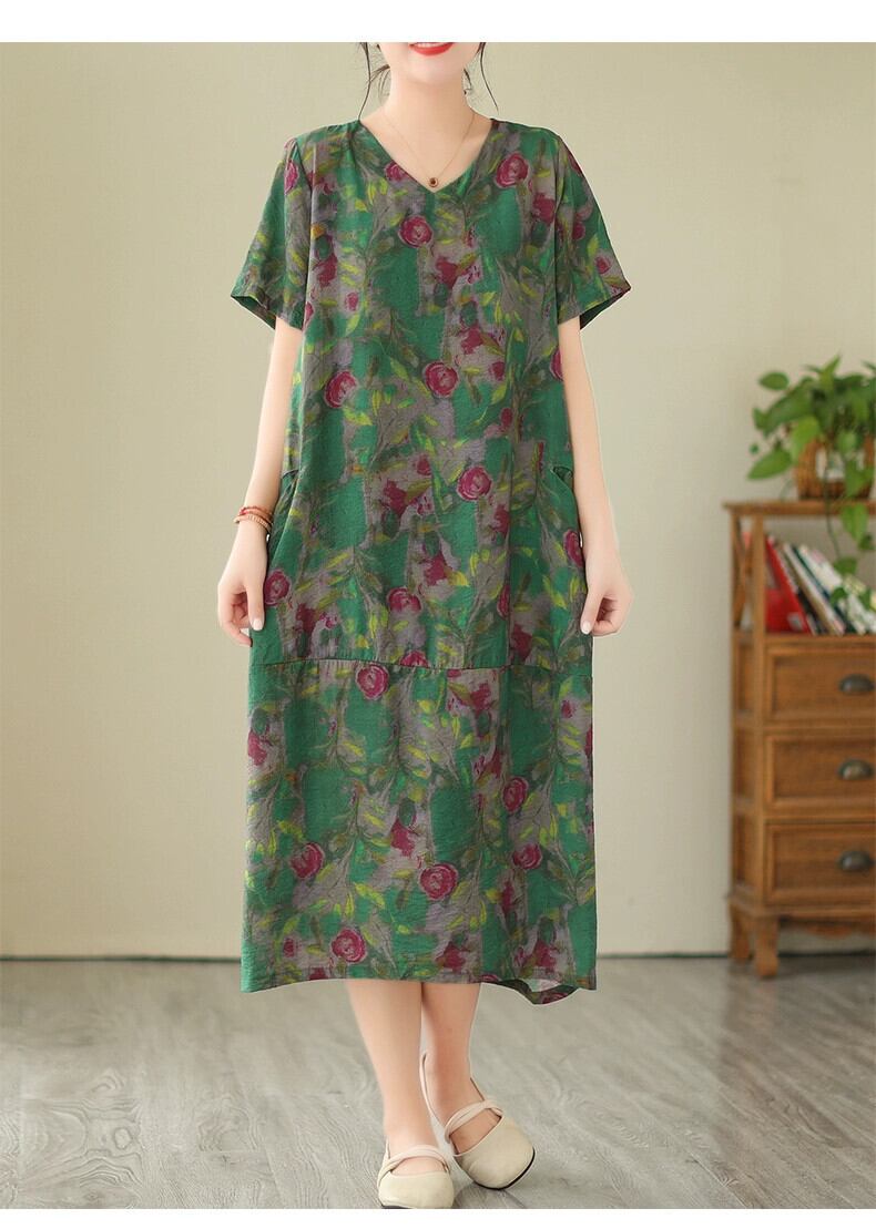 クリアランス漏れ〜有名カウンターからのレトロなプリントのコットンとリネンのドレス、ゆったりとした大きいサイズのVネックリネンのミモレ丈スカート 大きめサイズ sine13326727549