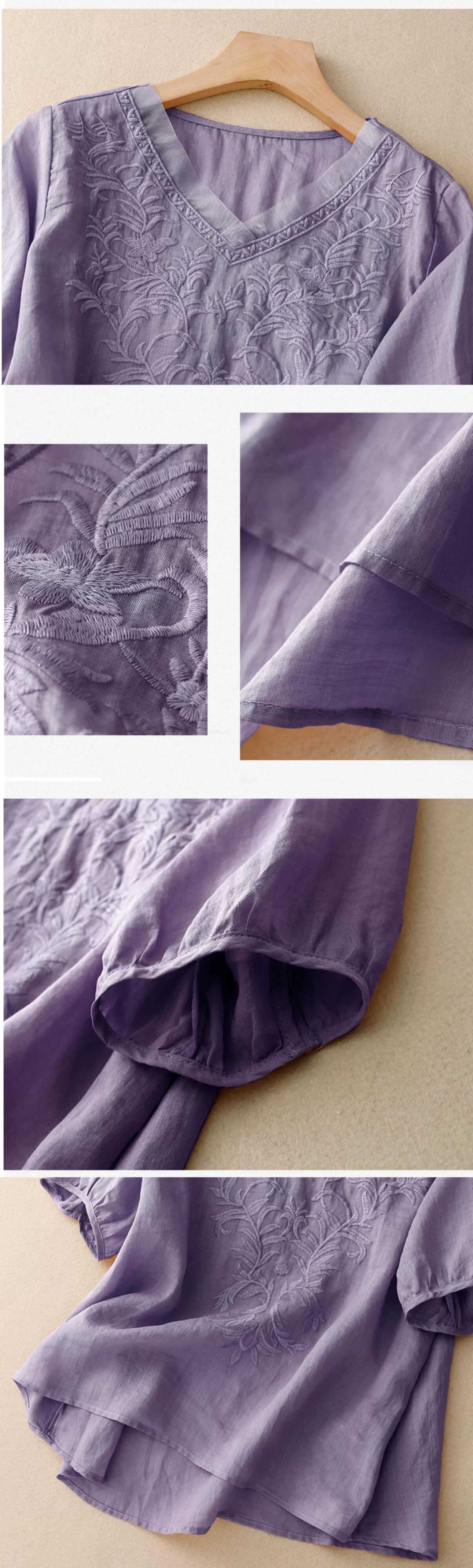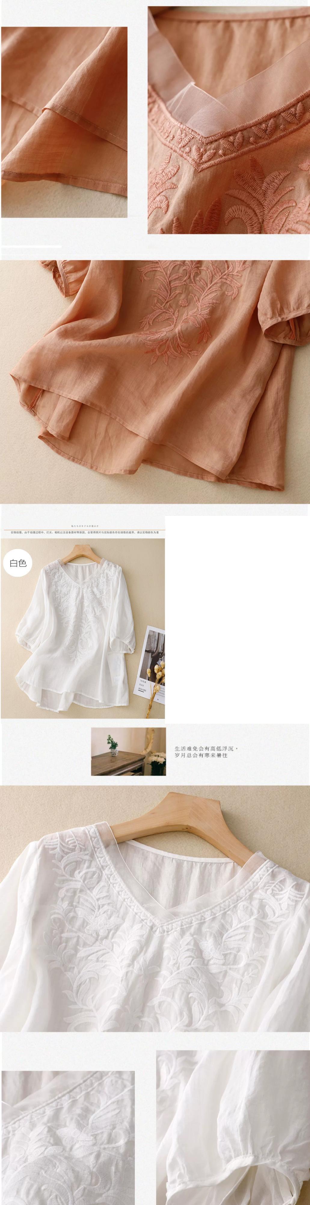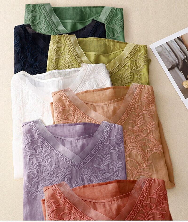 カウンタークリアランスグッズ、薄手のラミー半袖Tシャツ、レディース、ゆったりとした刺繍Vネックの綿麻シャツトップス レッド コットン sine26144827627