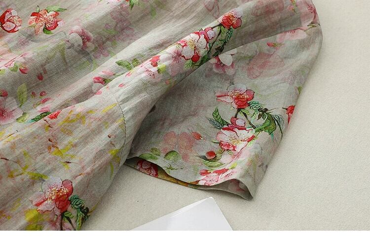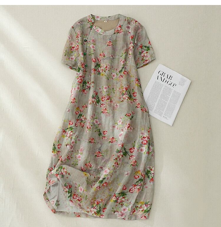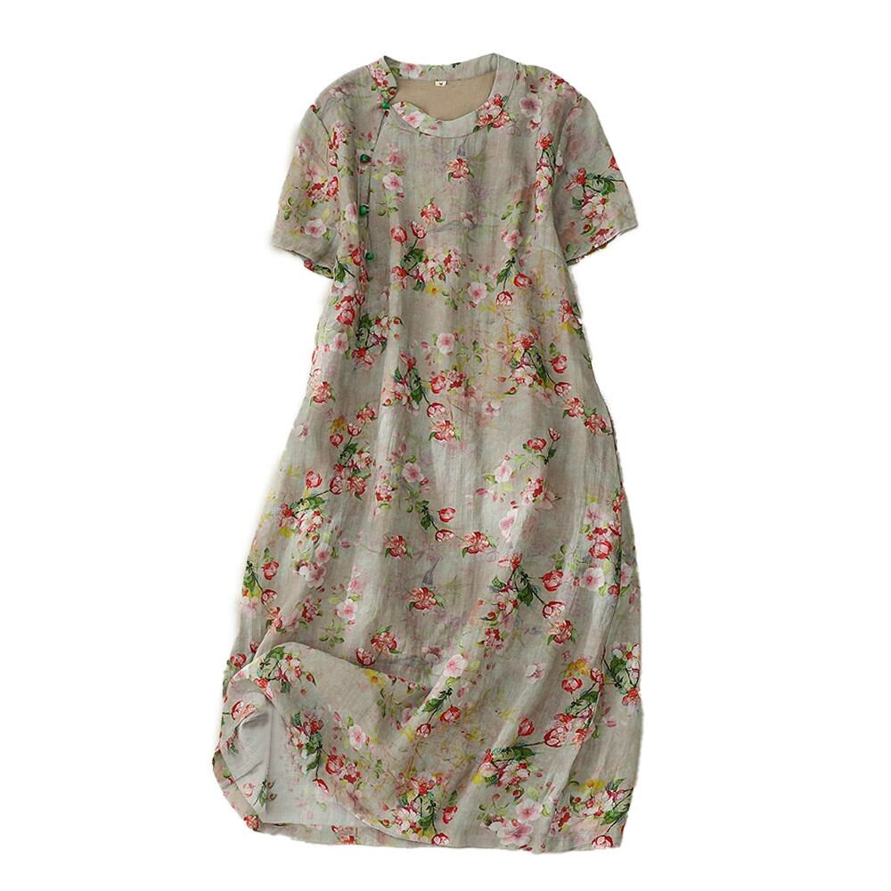 クリアランスブランド牛グッズカウンター最終在庫中国風斜めラペルラミーチャイナドレスゆったりとした軽いリネンの花柄ドレス sine25848939509