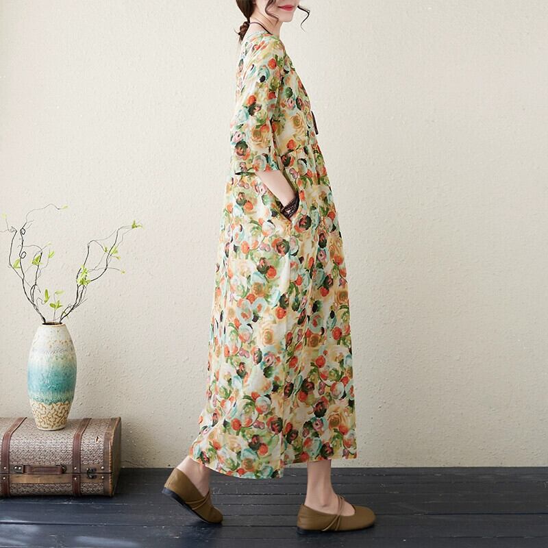 eign trade counter brand テールグッズ 綿麻花柄ワンピース レディース ゆったり 大きいサイズ リネン ラウンドネック Aライン ロングスカート 裾大きい コットン 大きめサイズ Oネック sine18050319789